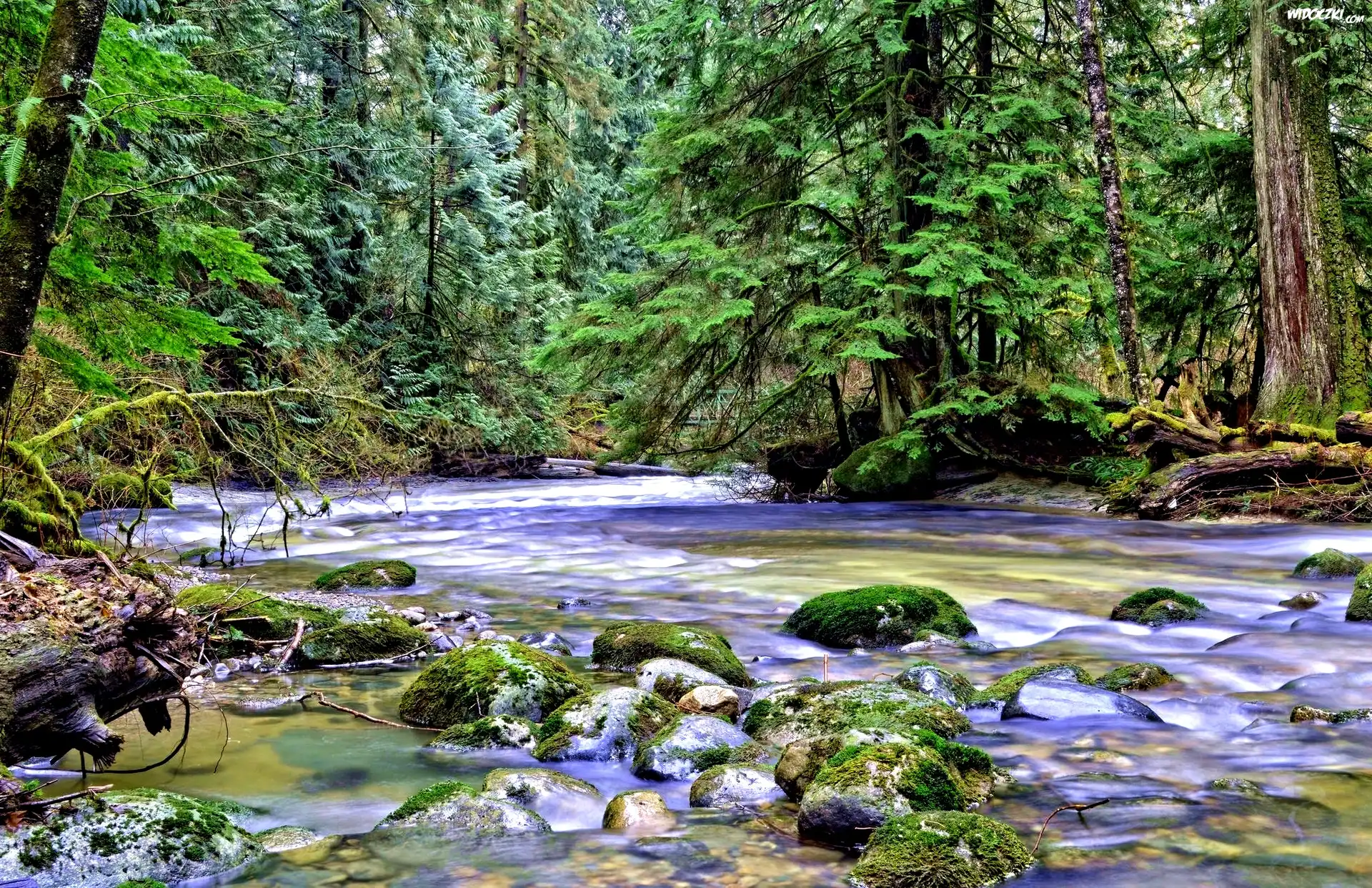 Zdjęcia, Las, Rzeka, Omszałe, Kamienie