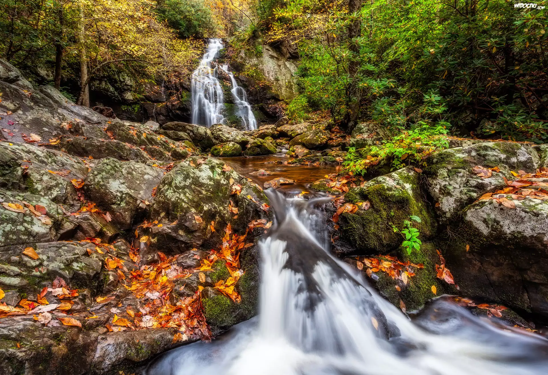 Zdjęcia, Las, Skały, Wodospad, Jesień, Opadłe, Liście