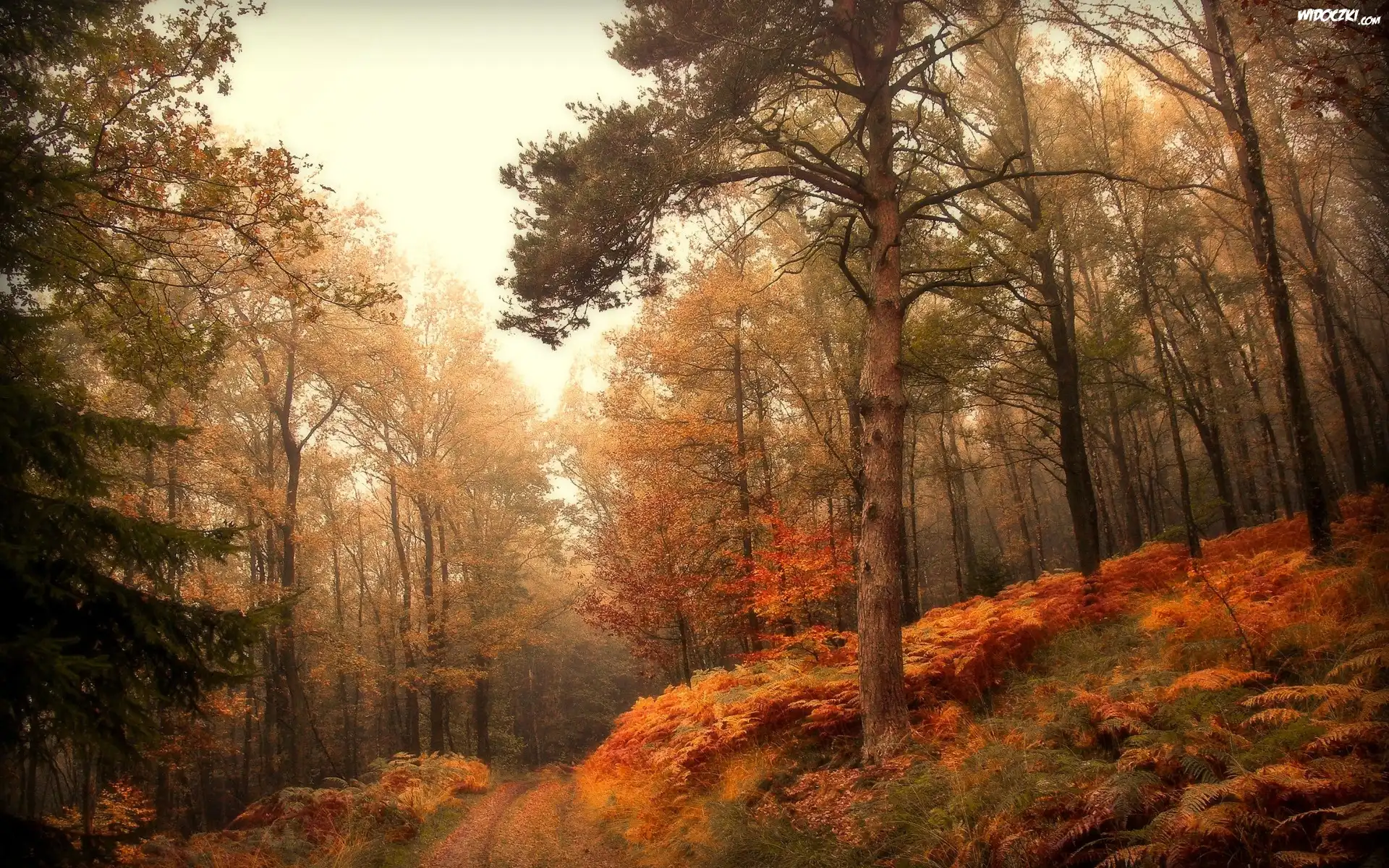 Las, Jesień, Dróżka, Paprocie, Drzewa