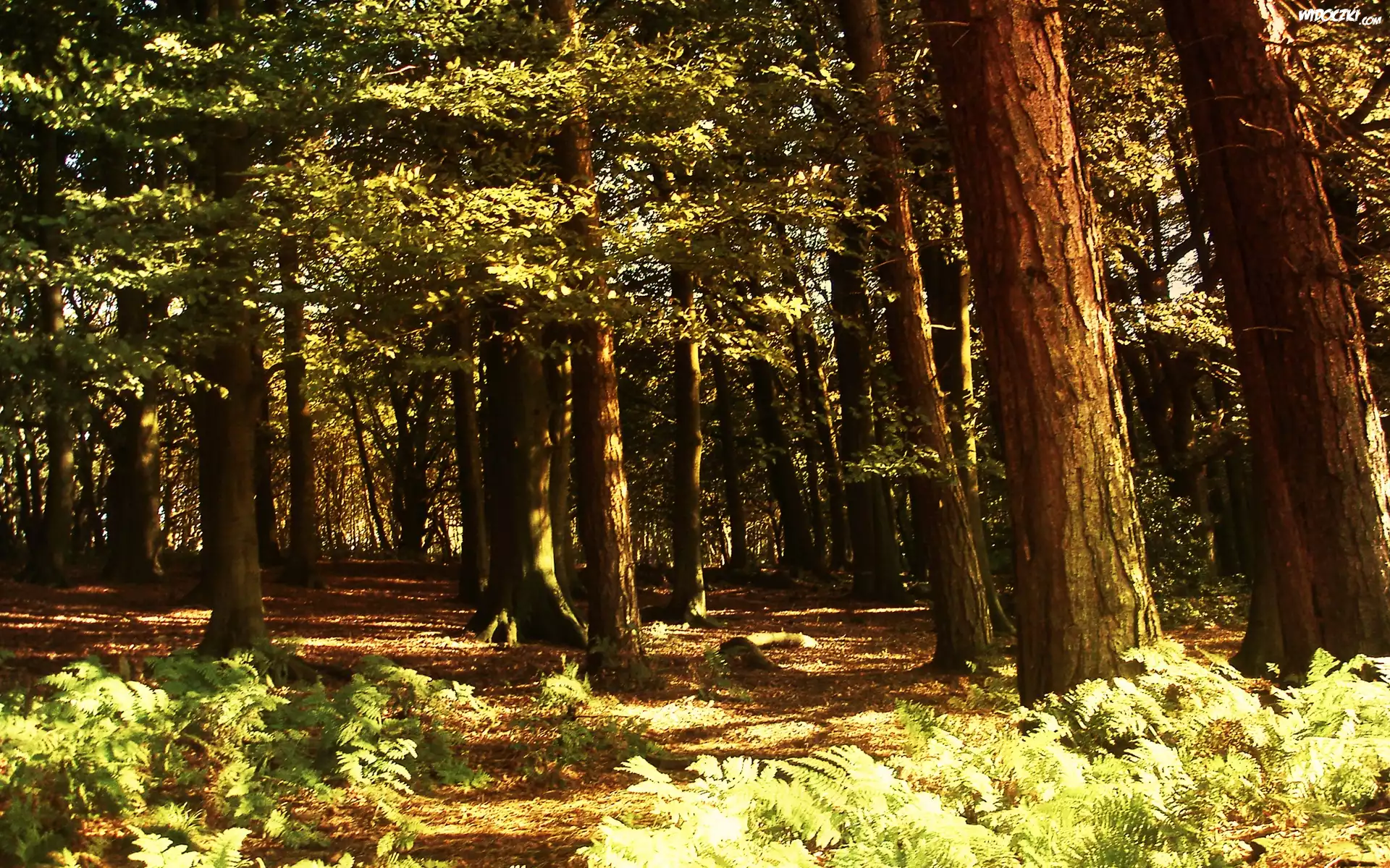 Zdjęcia, Las, Drzew, Paprocie, Liście