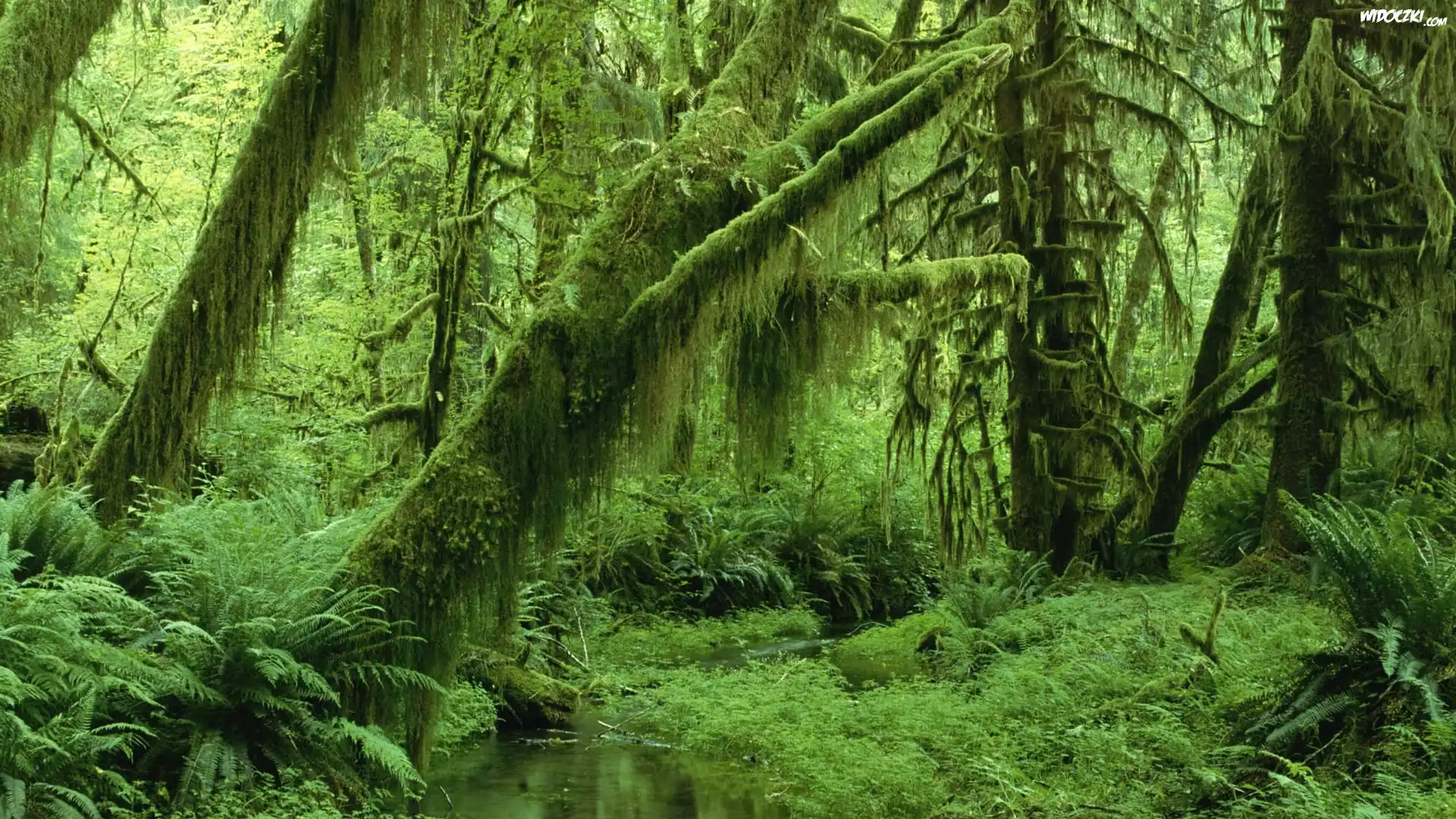 Zdjęcia, Las, Omszałe, Drzewa, Paprocie, Rzeczka