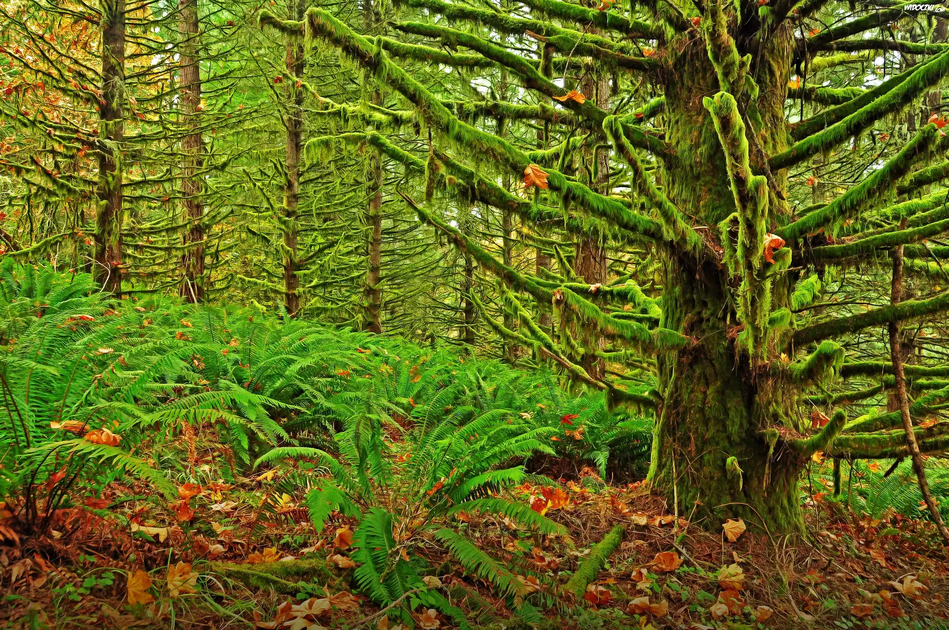 Zdjęcia, Las, Mchy, Paprocie, Liście