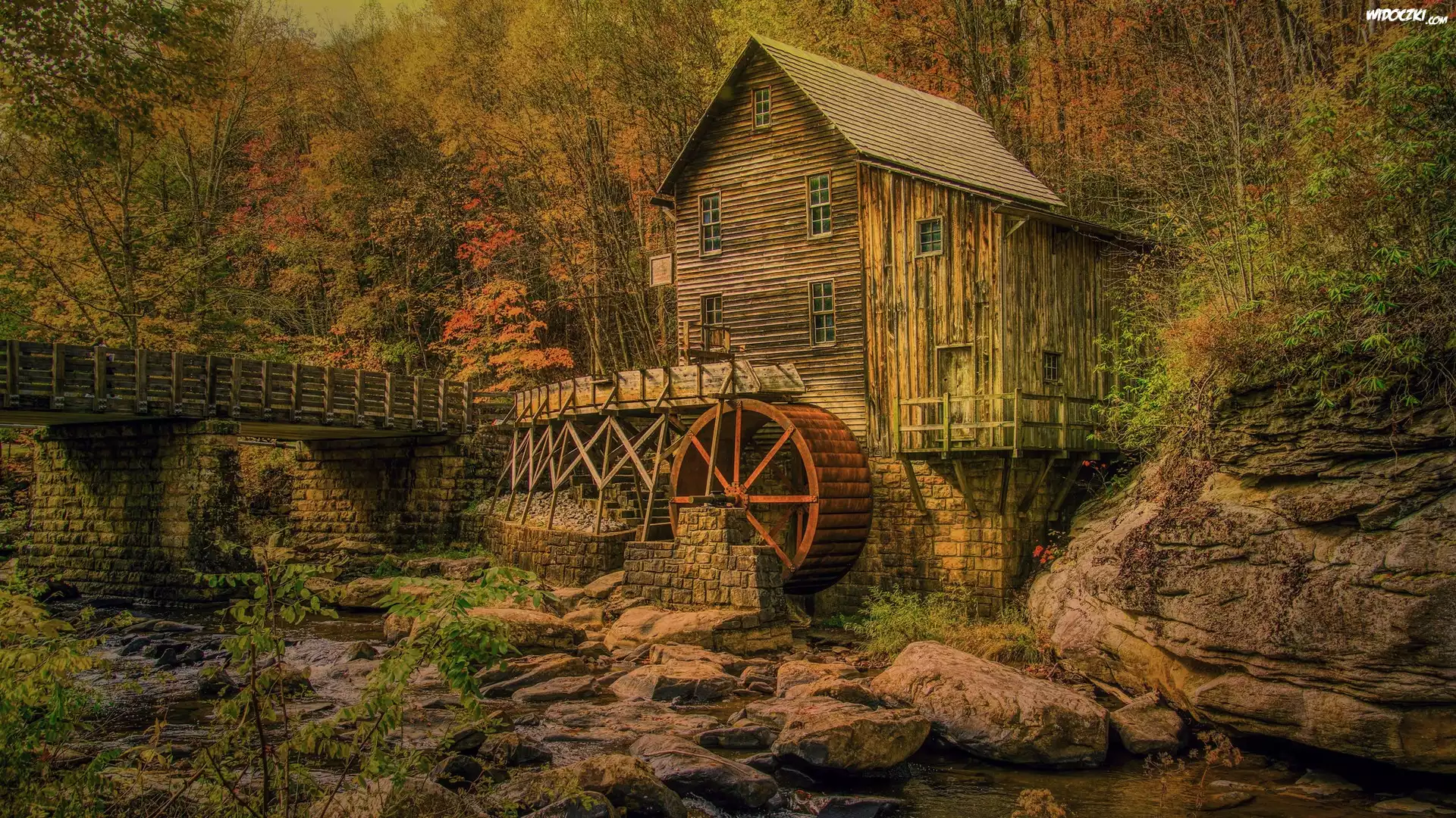 Jesień, Młyn, Glade Creek Grist Mill, Las, Drzewa, Skały, Park Babcock State, Wirginia Zachodnia, Stany Zjednoczone |
