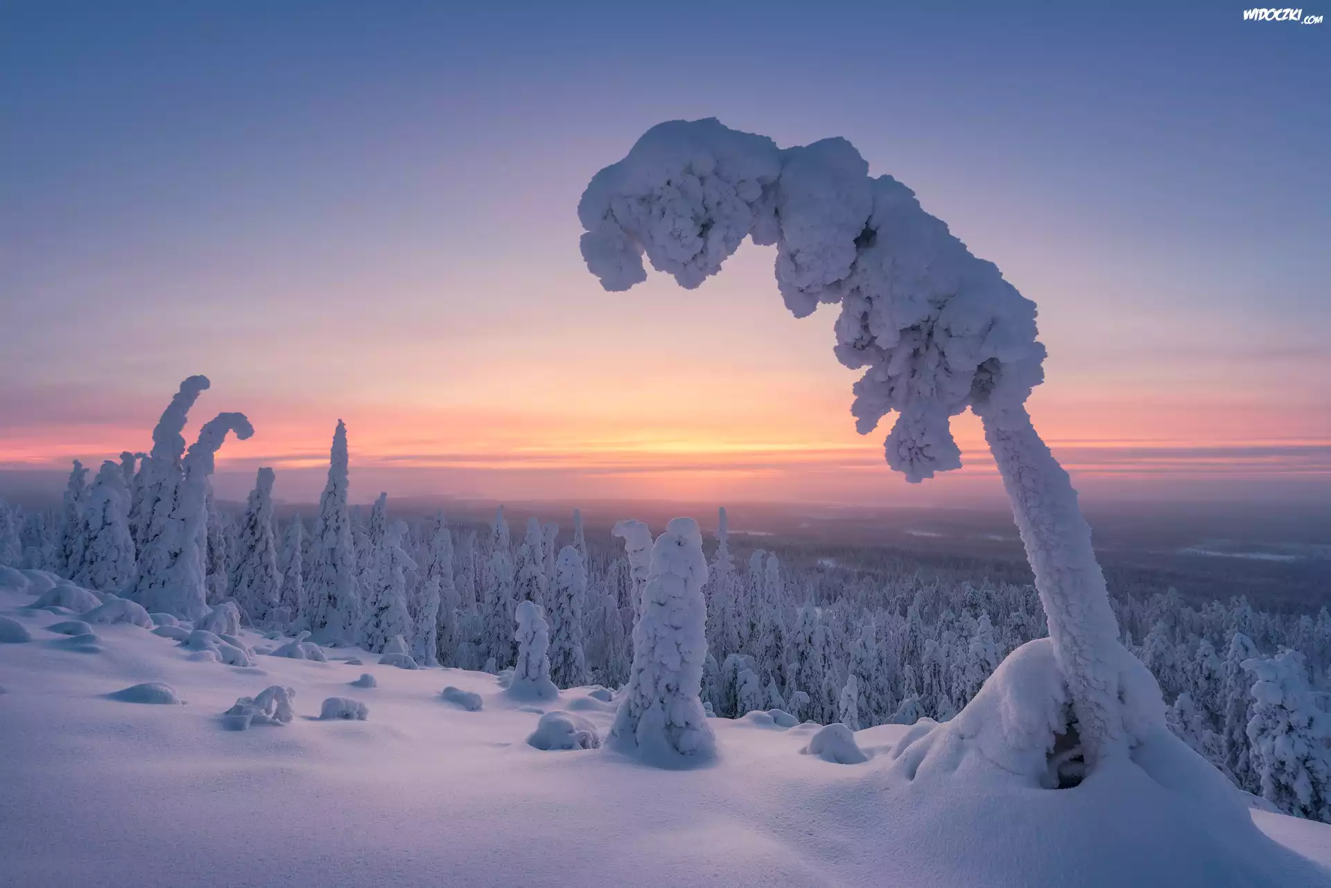 Park Narodowy Riisitunturi, Zima, Las, Ośnieżone, Drzewa, Wschód słońca, Gmina Posio, Laponia, Finlandia Finlandia |