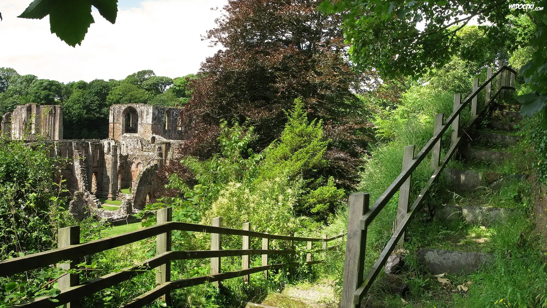 Zdjęcia, Las, Ruiny, Drzewa, Schody, Płot, Ogrodzenie