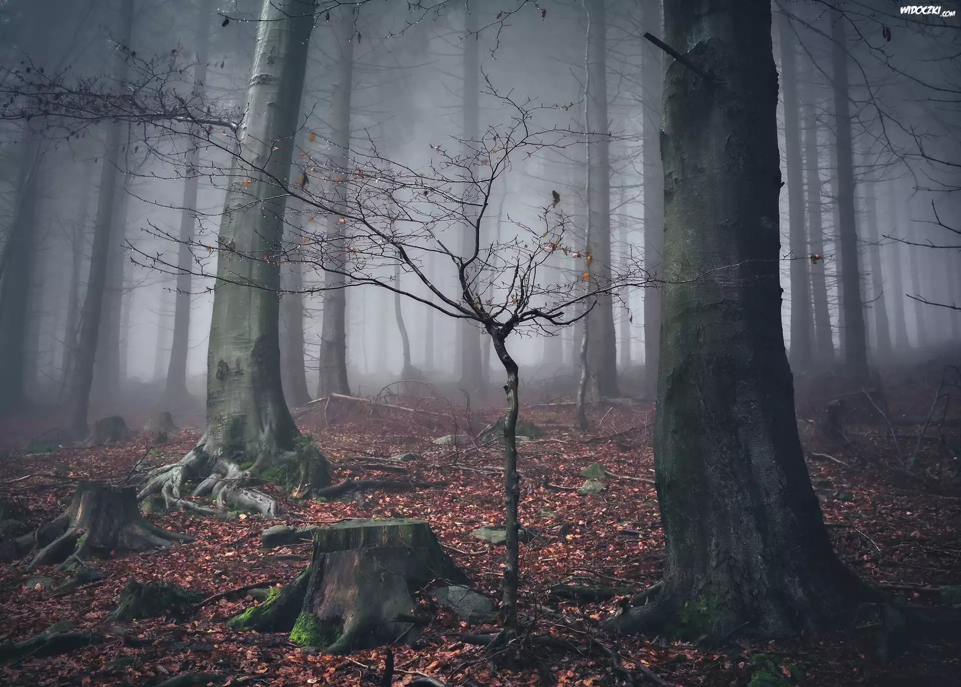 Zdjęcia, Las, Drzewa, Pniaki, Mgła