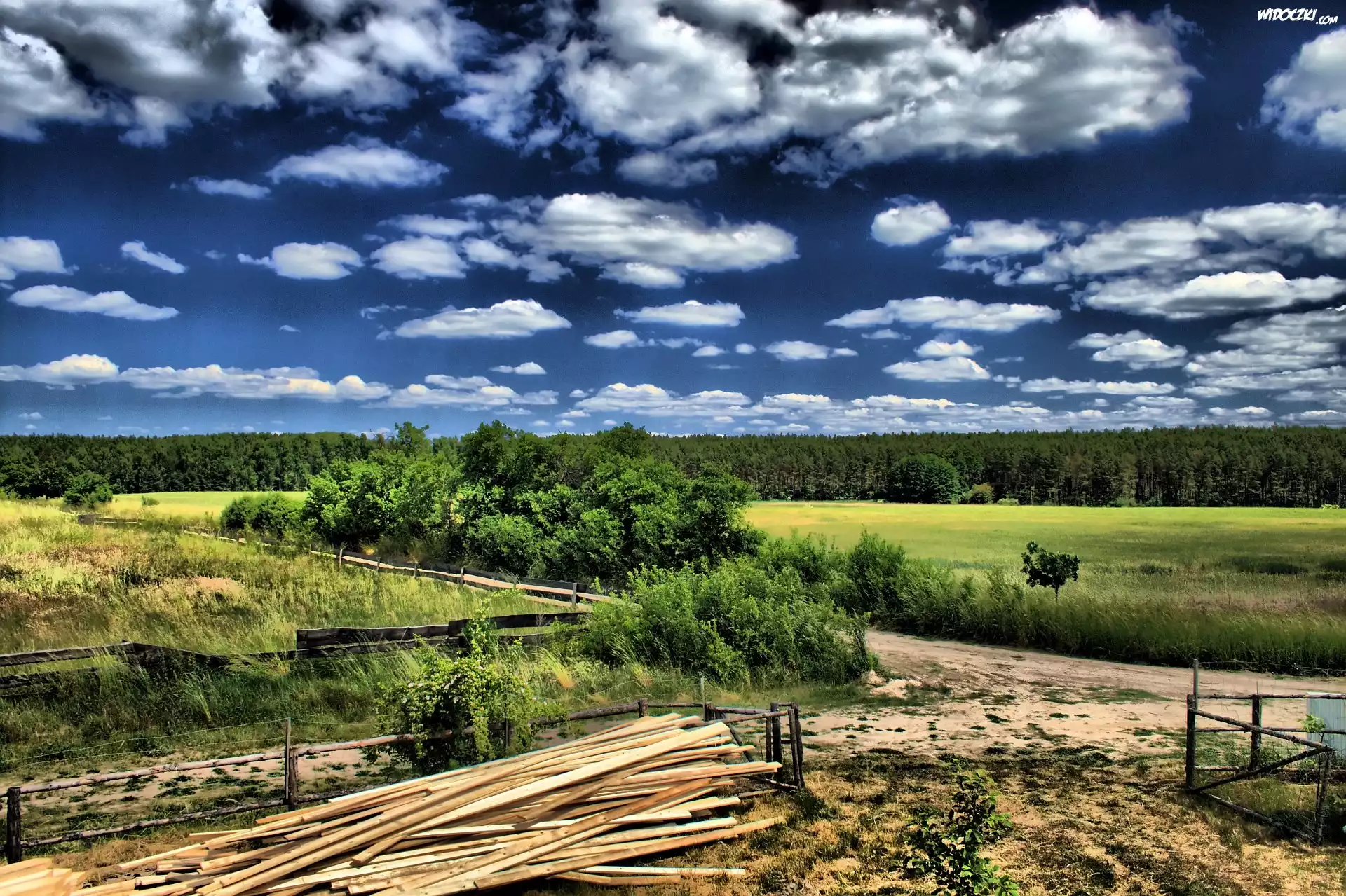 Zdjęcia, Las, Drzewa, Pola, Obłoki