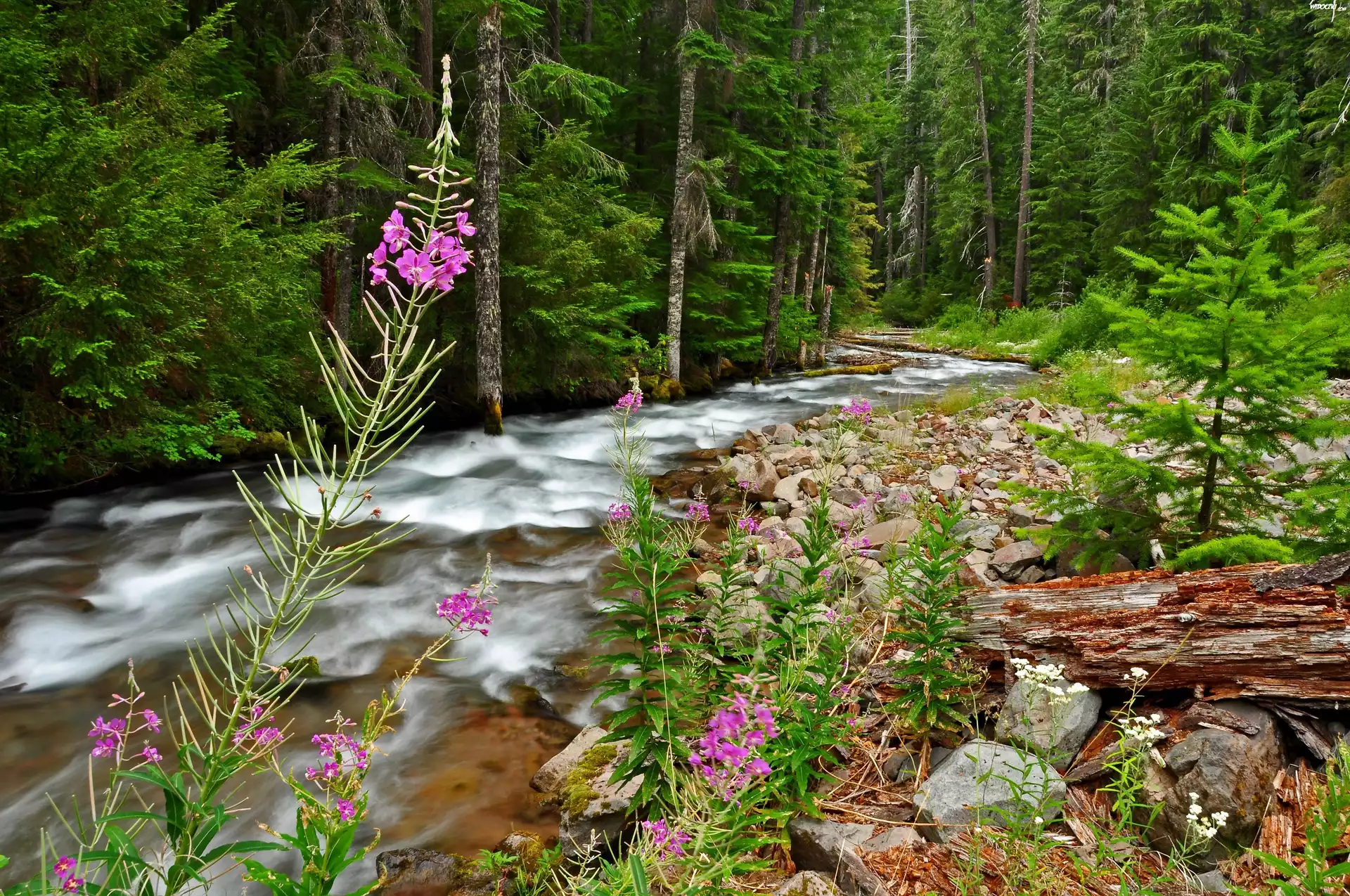 Las, Rzeka, Kamienie, Polne, Kwiaty