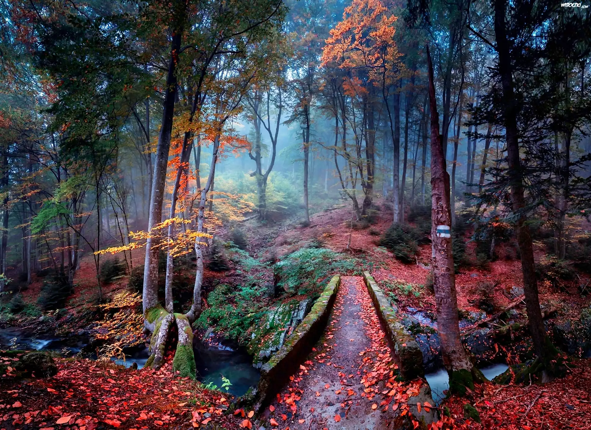 Zdjęcia, Las, Strumyk, Mostek, Poranek, Mgła