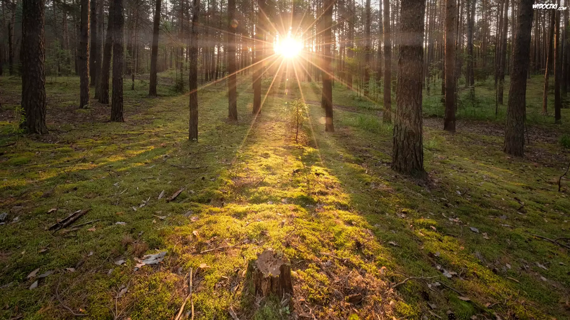 Zdjęcia, Las, Promienie słońca, Poranek, Drzewa