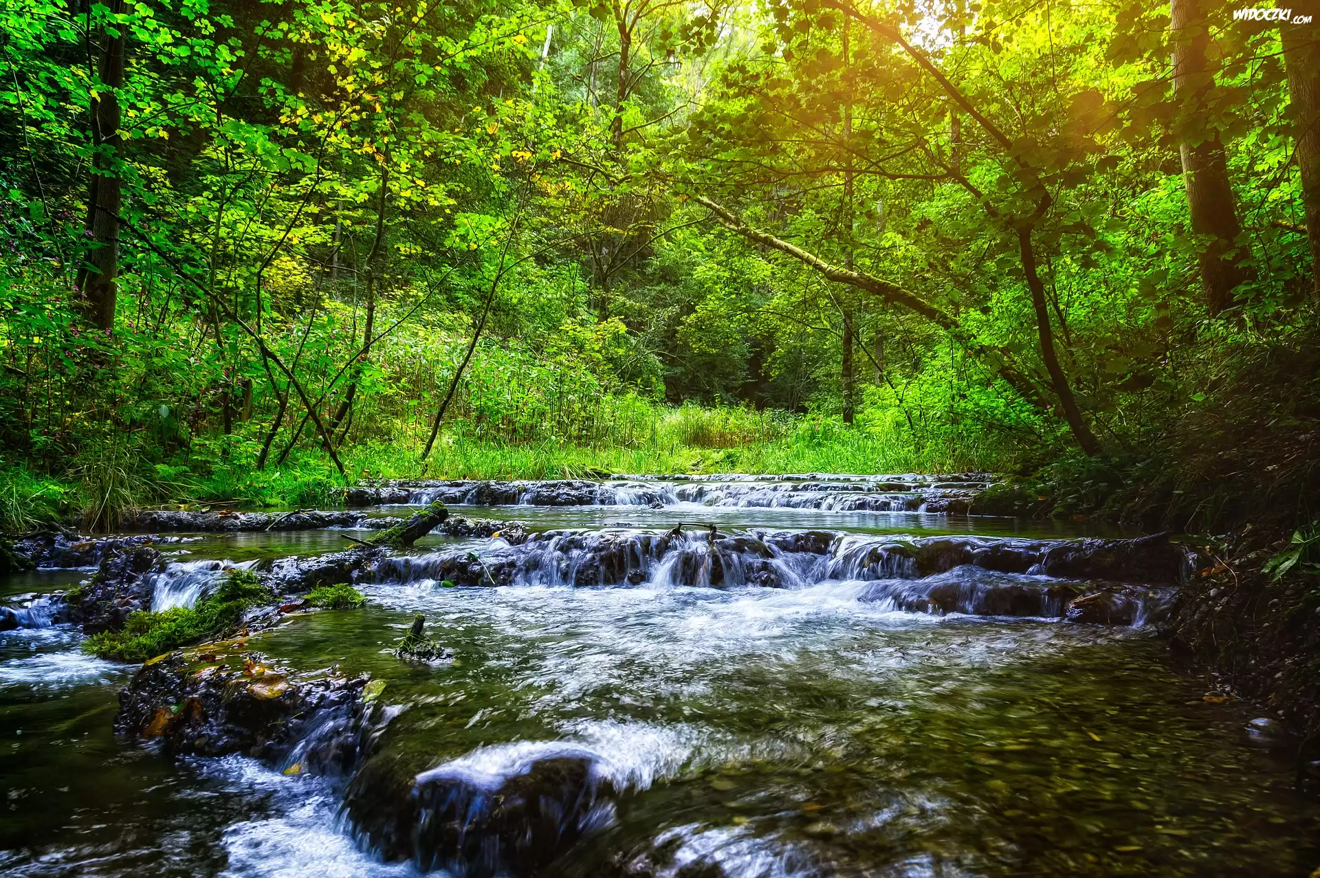 Drzewa, Las, Potok, Rzeka, Kamienie