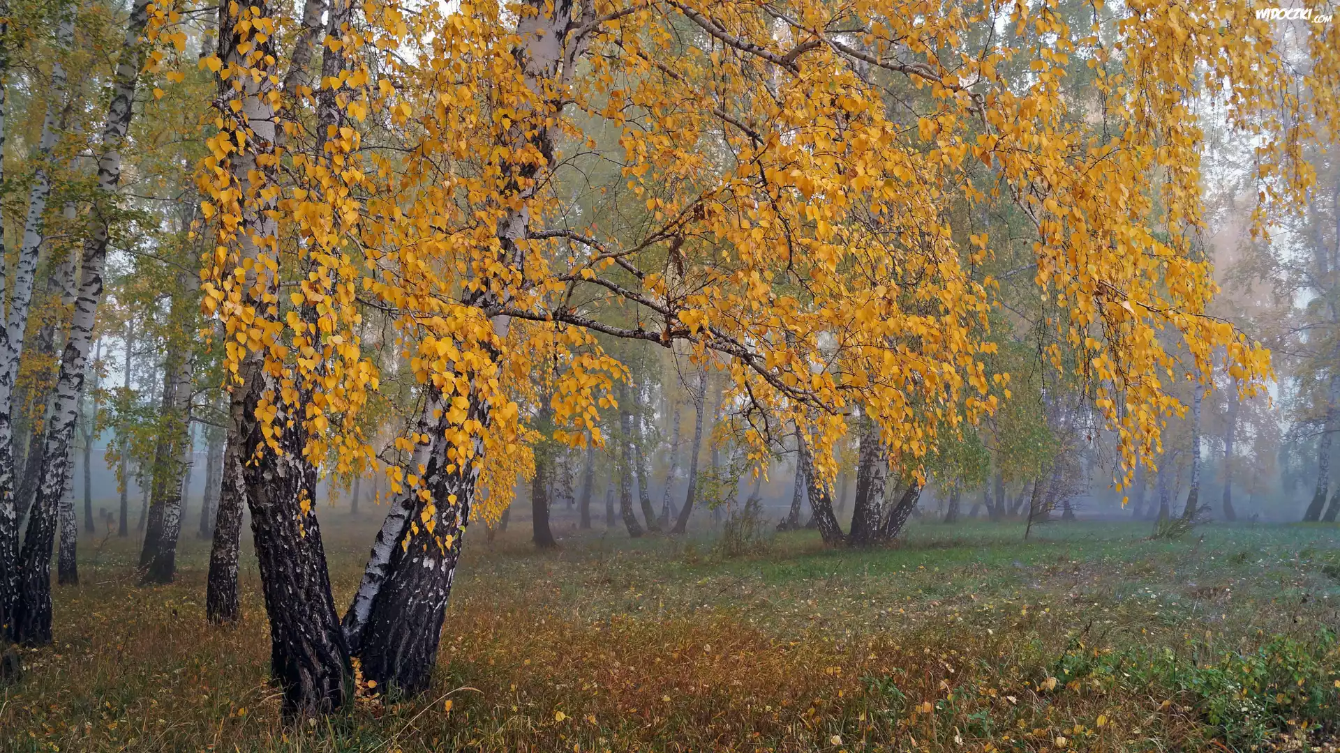 Zdjęcia, Brzozy, Las, Pożółkłe, Liście, Jesień