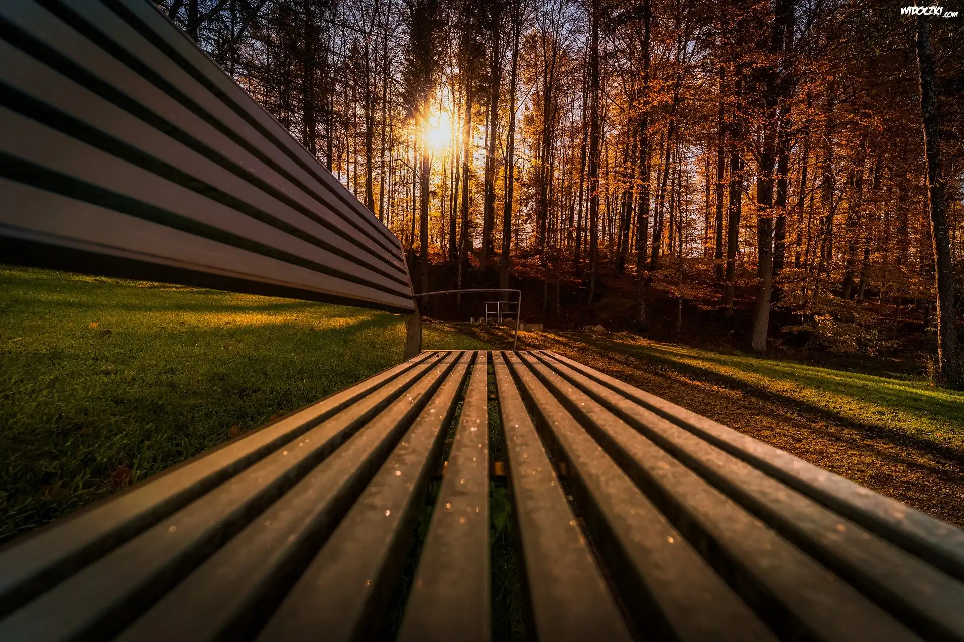 Zdjęcia, Las, Drzewa, Ławka, Promienie słońca