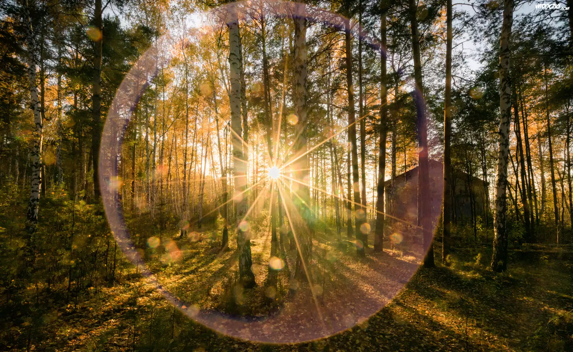 Zdjęcia, Las, Drzewa, Domek, Promienie słońca