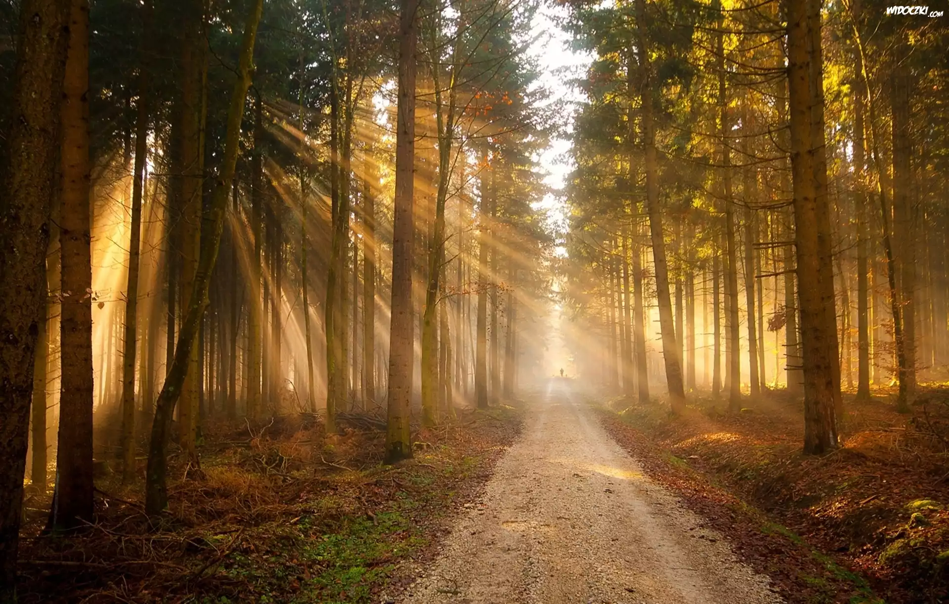 Zdjęcia, Las, Drzewa, Droga, Promienie, Słońca