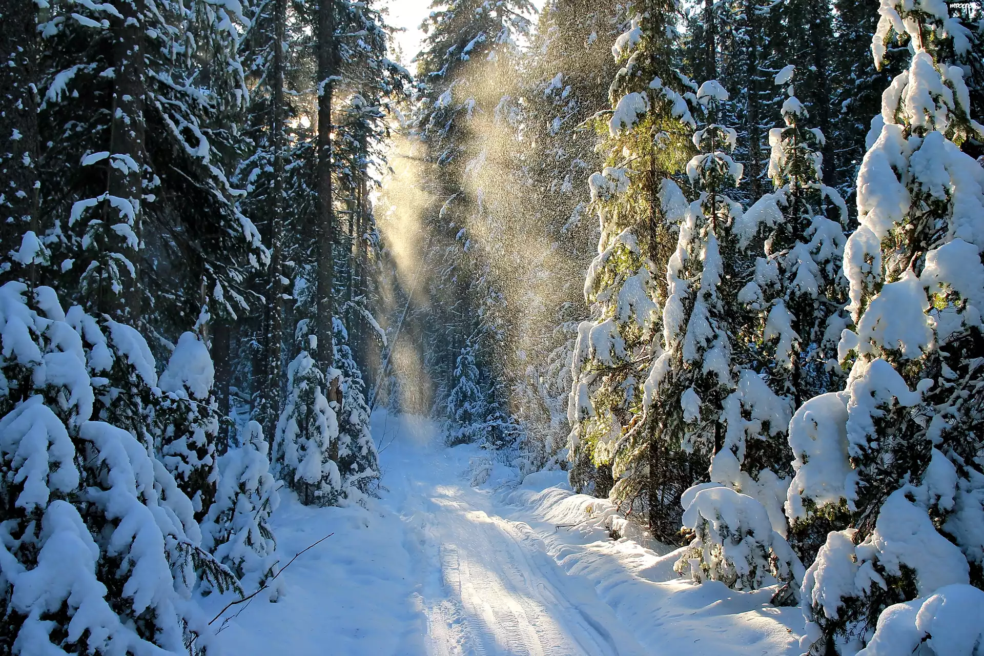 Las, Droga, Drzewa, Śnieg,Promienie, Słońca