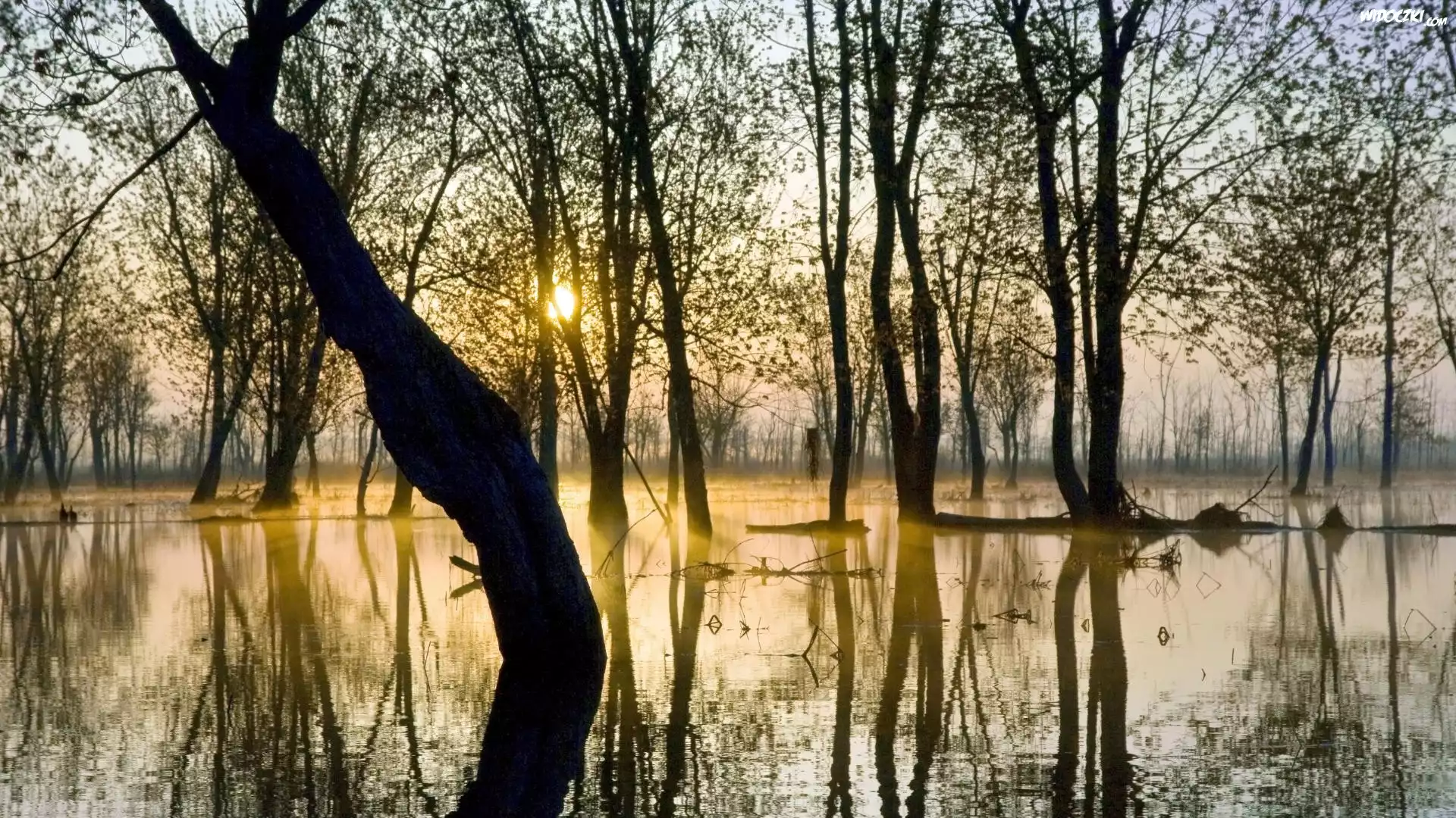 Las, Rzeka, Drzewa, Promienie, Słońca