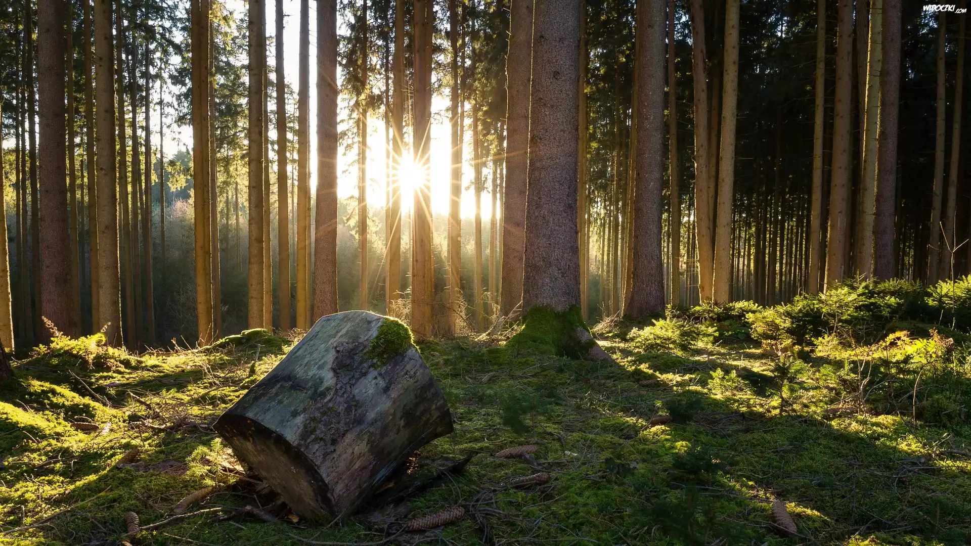 Zdjęcia, Las, Drzewa, Kłoda, Kloc, Promienie słońca