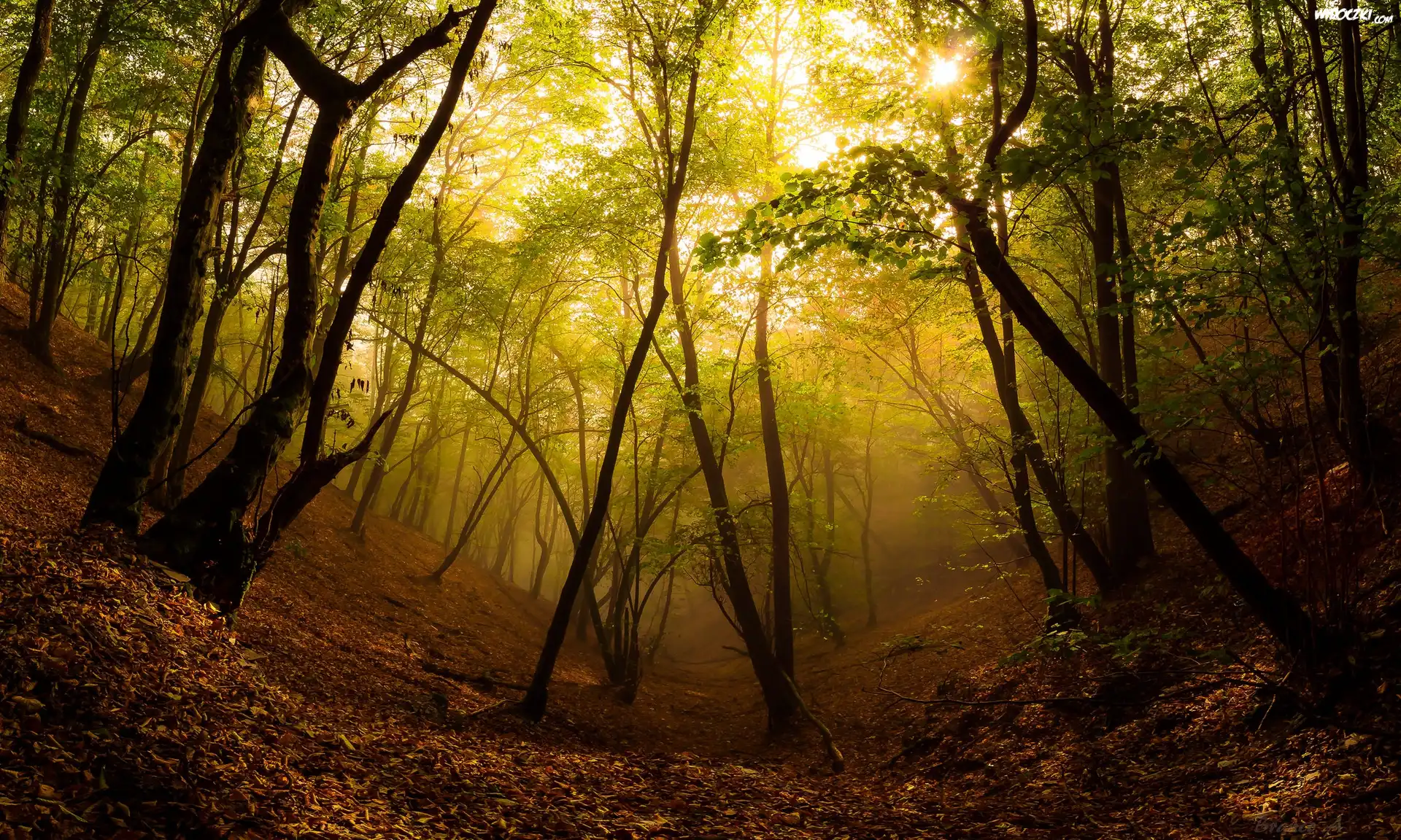 Zdjęcia, Las, Drzewa, Mgła, Promienie słońca
