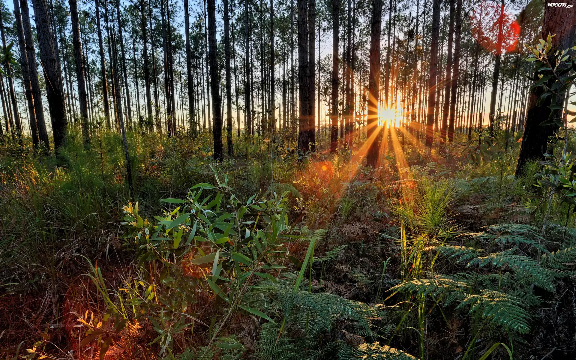 Las, Drzewa, Paprocie, Trawy, Promienie, Słońca