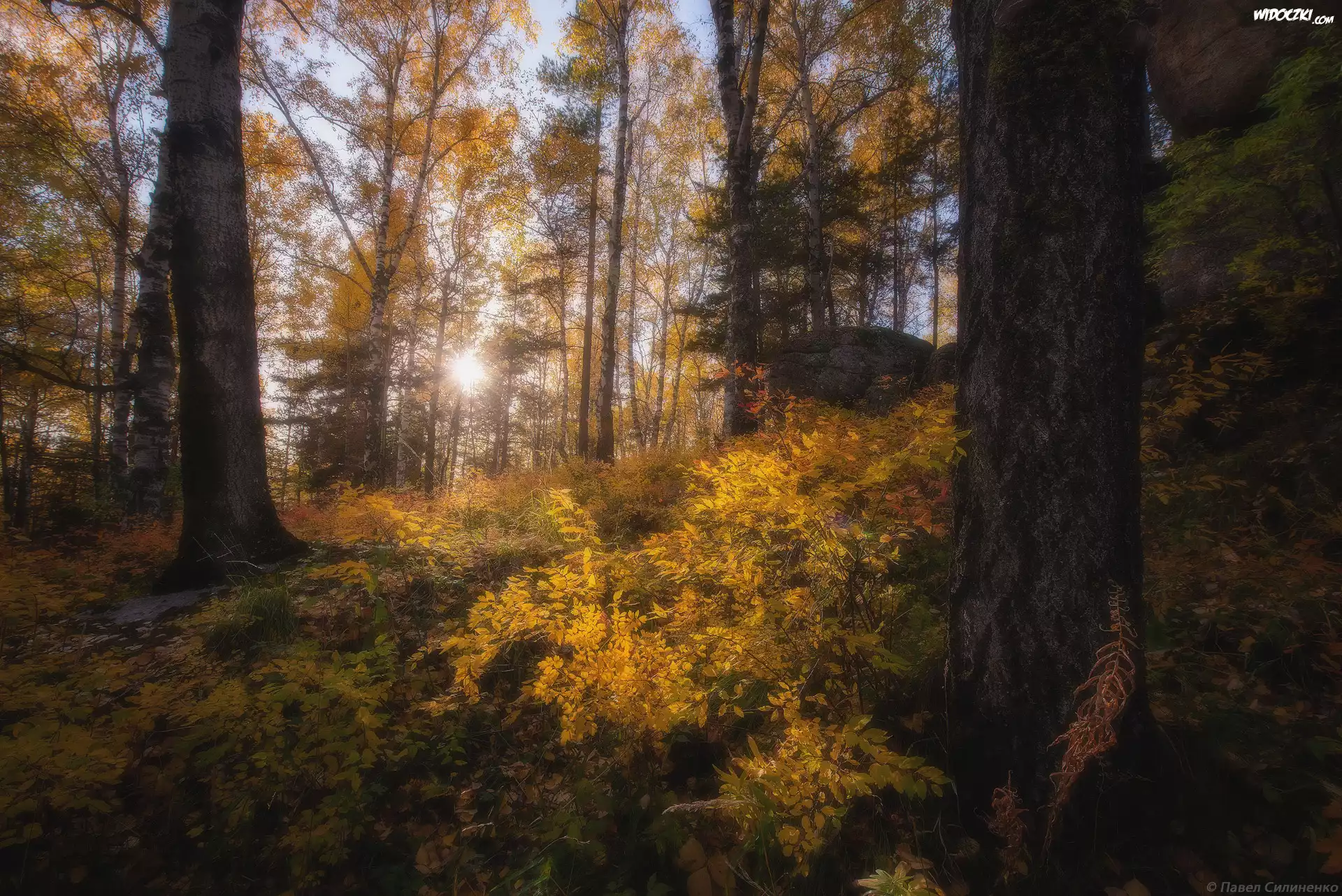 Las, Drzewa, Rośliny, Jesień, Promienie słońca