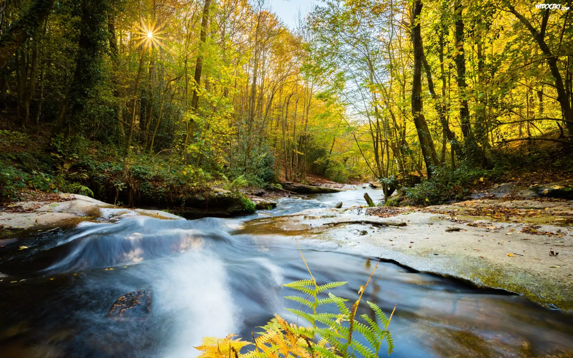 Zdjęcia, Las, Drzewa, Rzeka, Promienie słońca