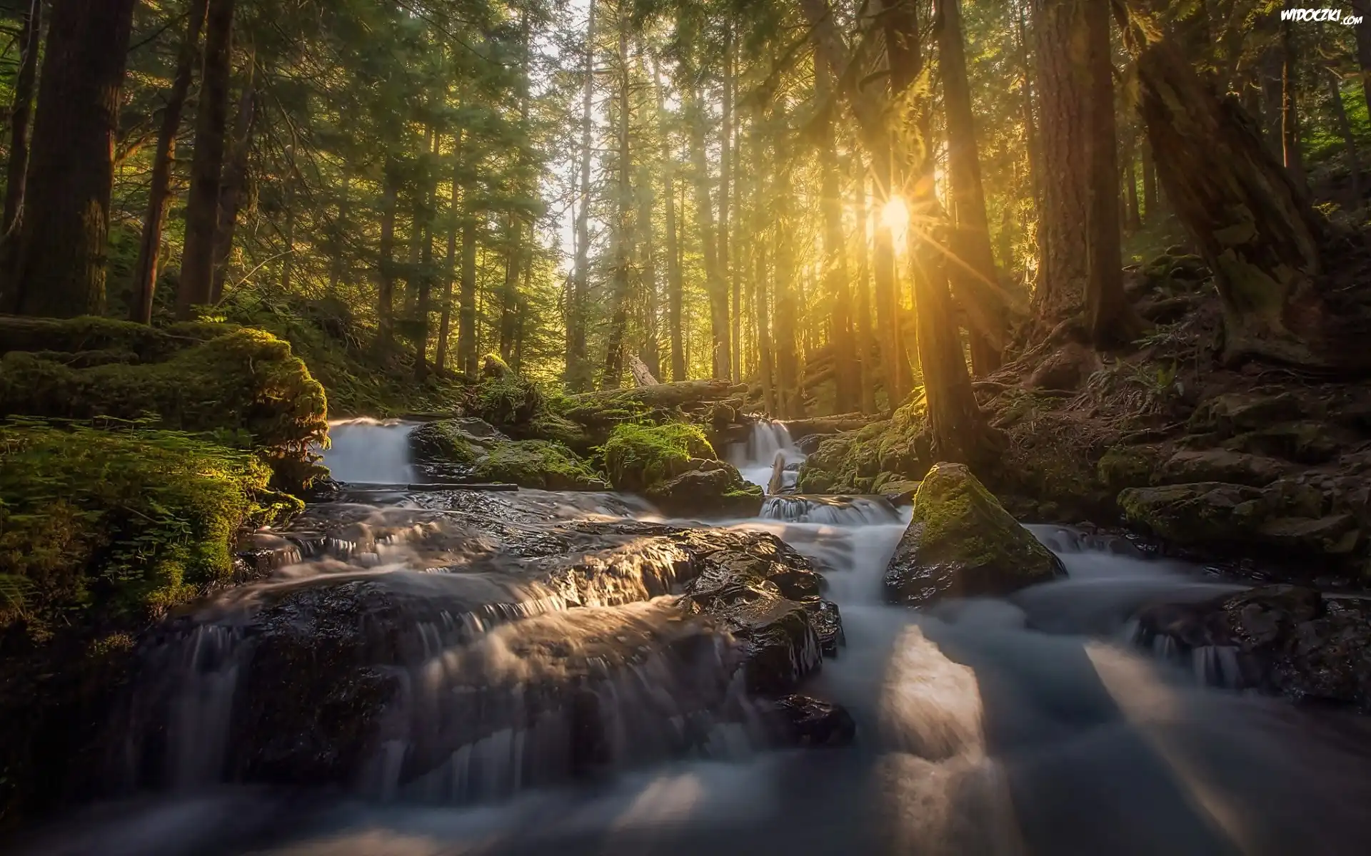 Zdjęcia, Las, Wodospad, Promienie, Słońce