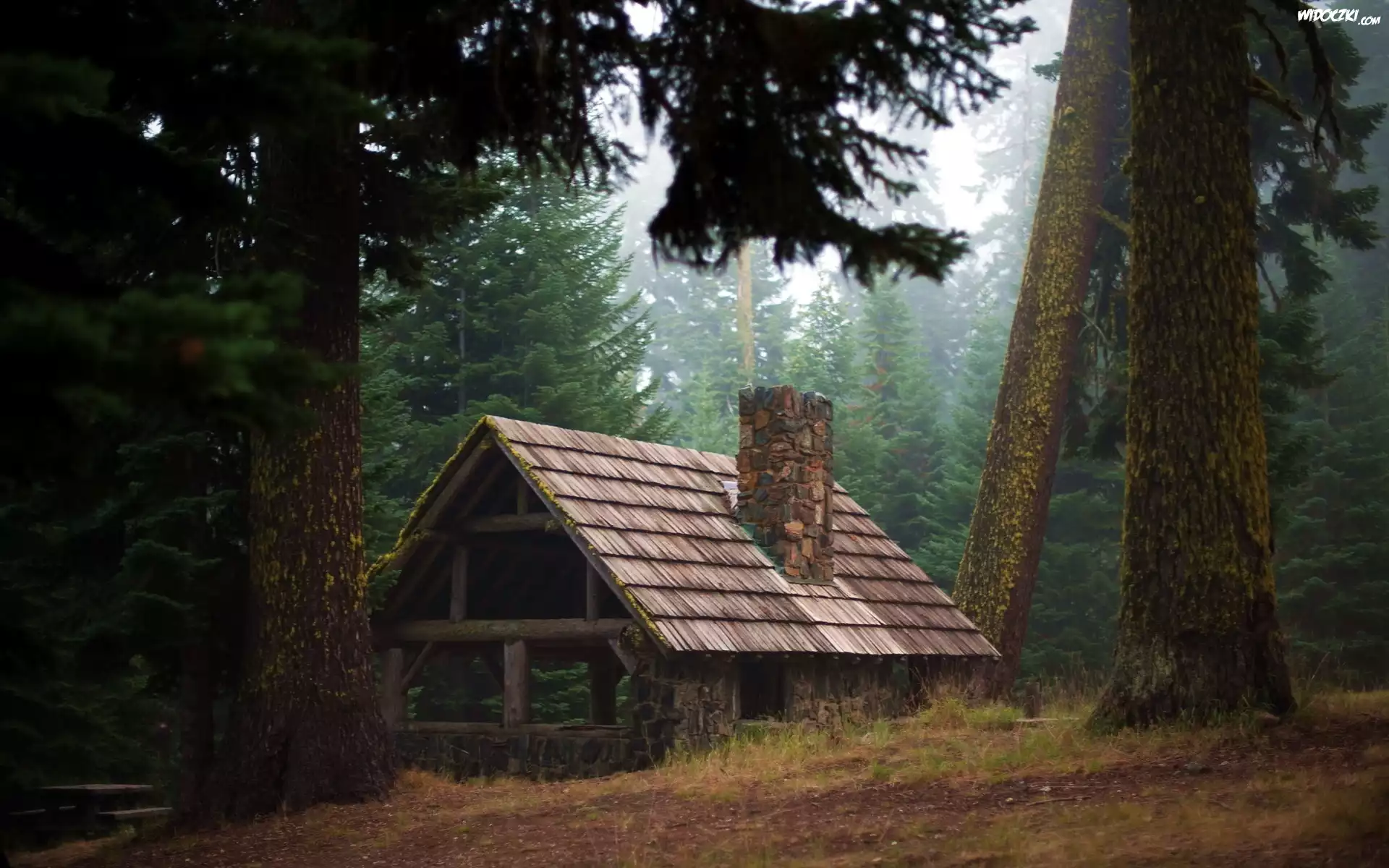 Zdjęcia, Las, Wiata, Ławki, Drzewa, Przebijające, Światło