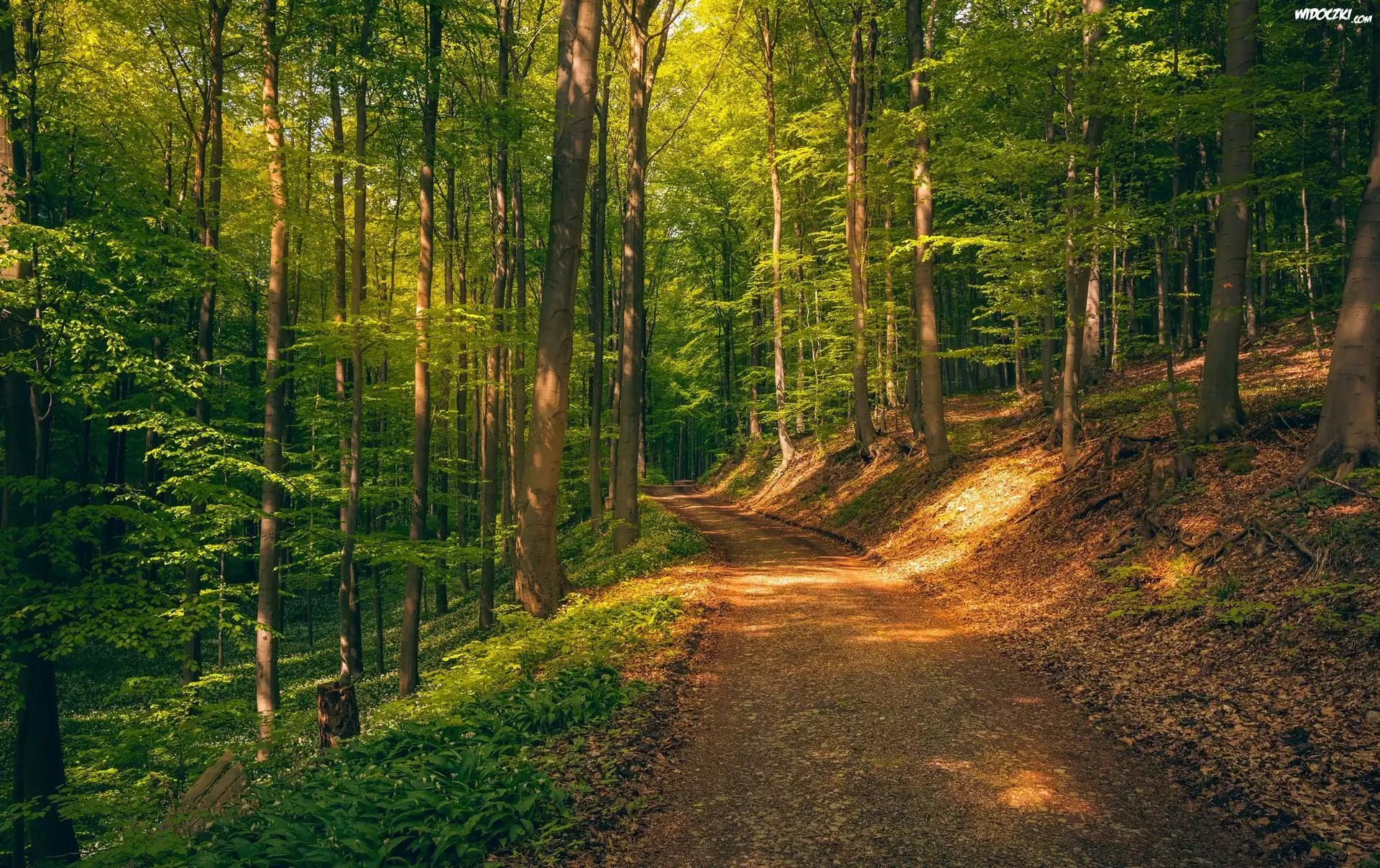 Zdjęcia, Las liściasty, Droga, Przebijające światło