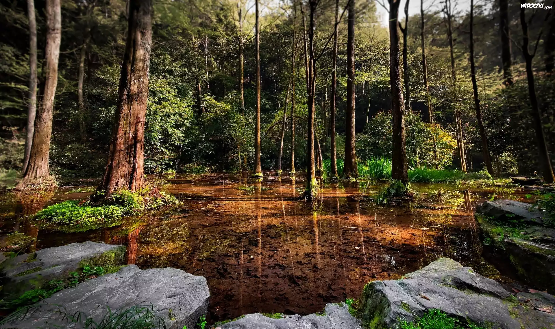 Zdjęcia, Las, Rozlewisko, Kamienie, Przebijające Światło