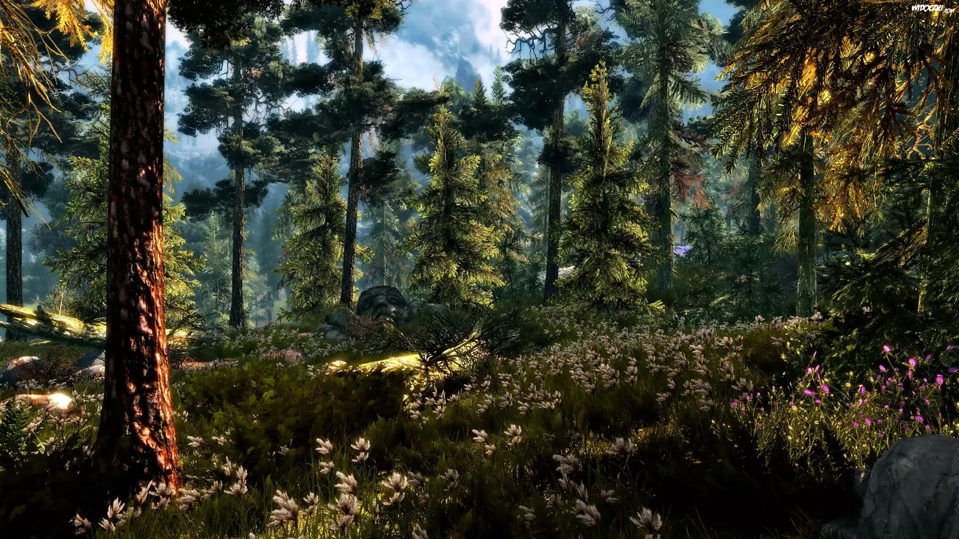 Las, Polana, Kwiaty, Przebijające, Światło