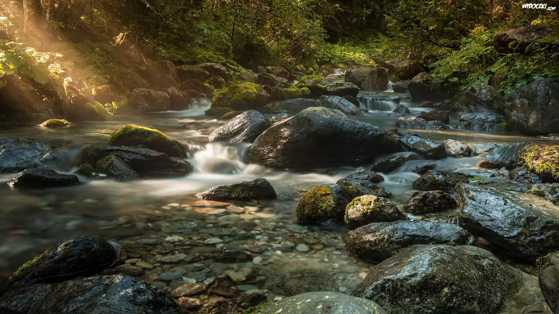 Zdjęcia, Las, Kamienie, Rzeka, Potok, Przebijające światło