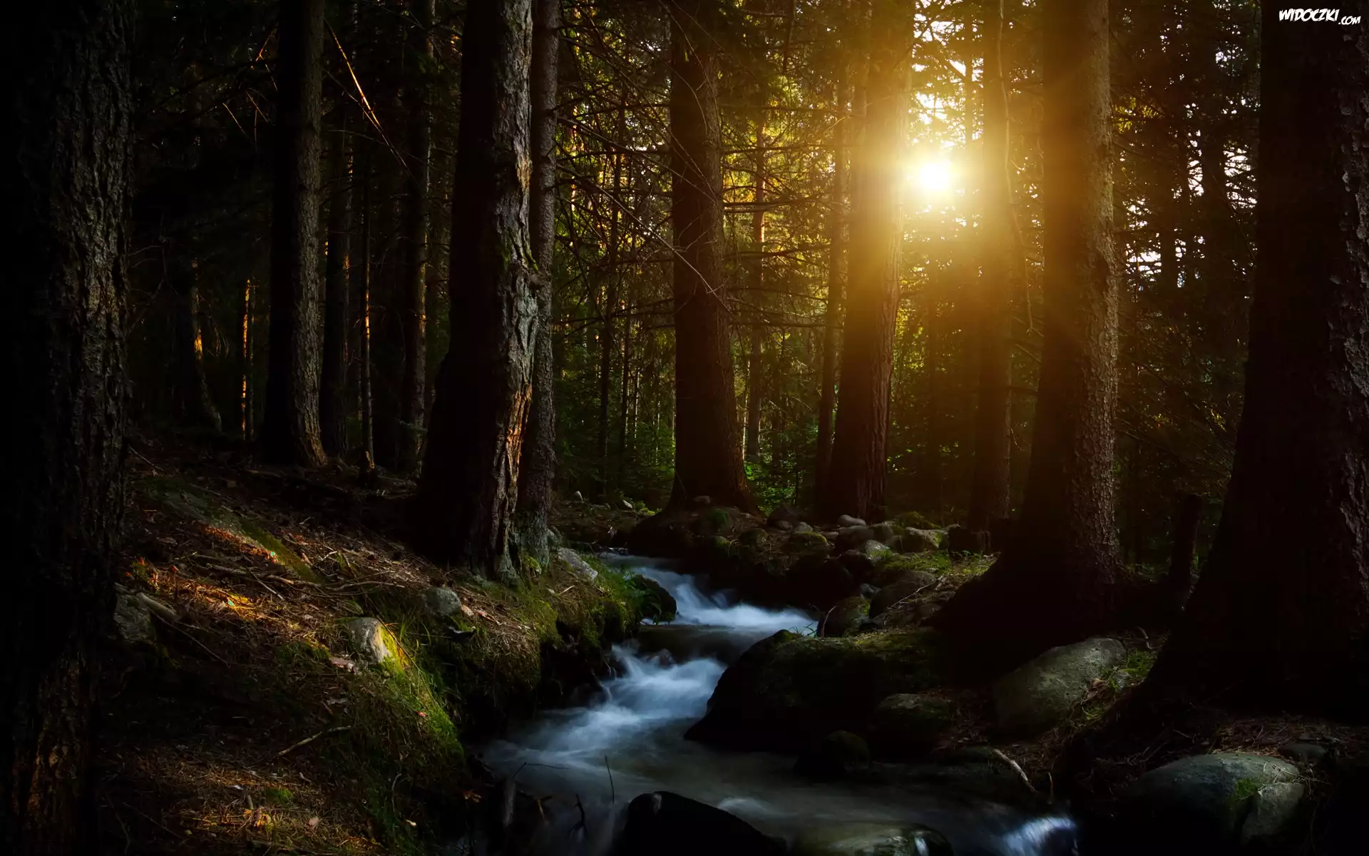 Las, Drzewa, Strumyk, Przebijające, Słońce