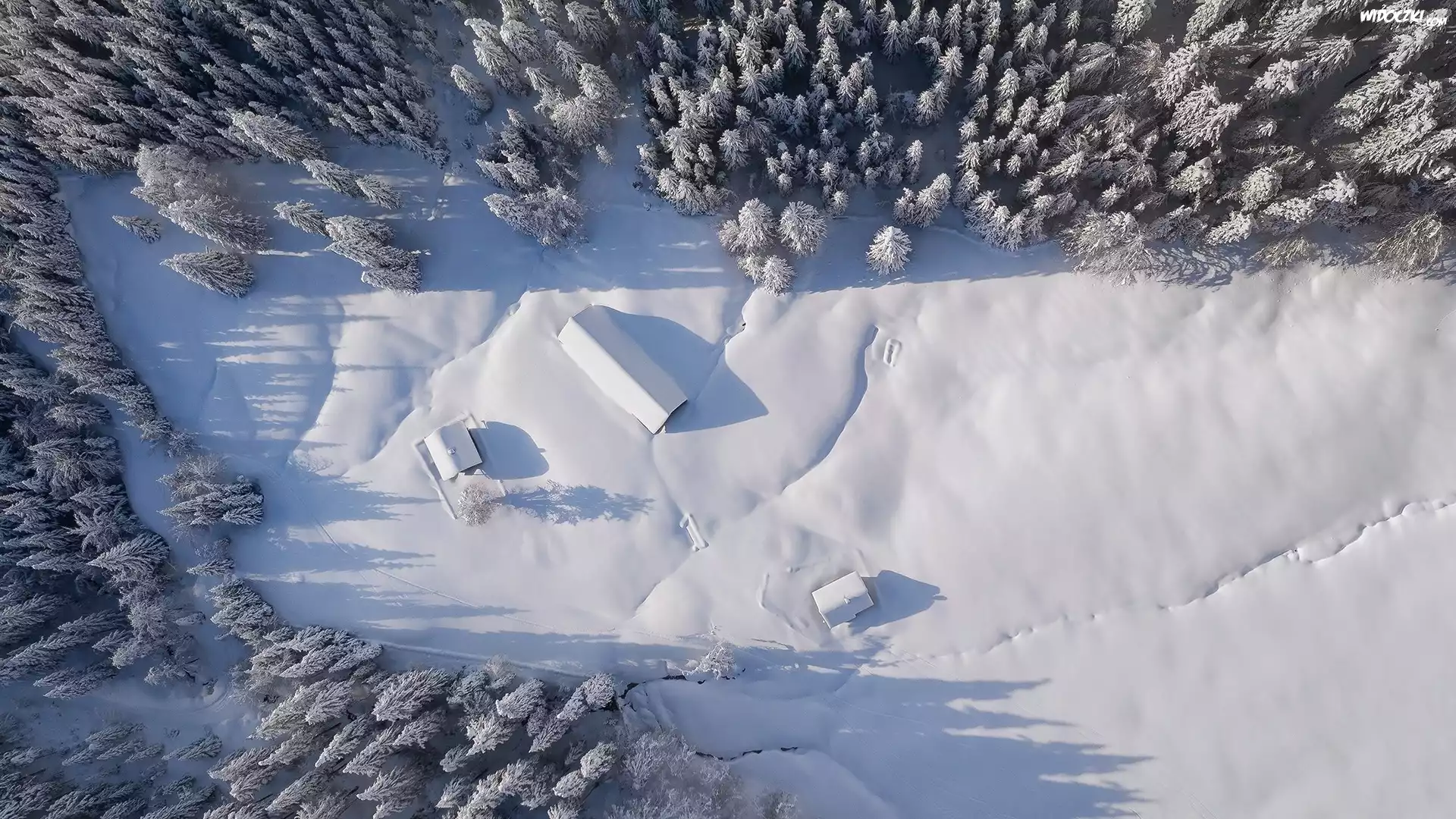 Z lotu ptaka, Zima, Śnieg, Domy, Dachy, Drzewa, Las