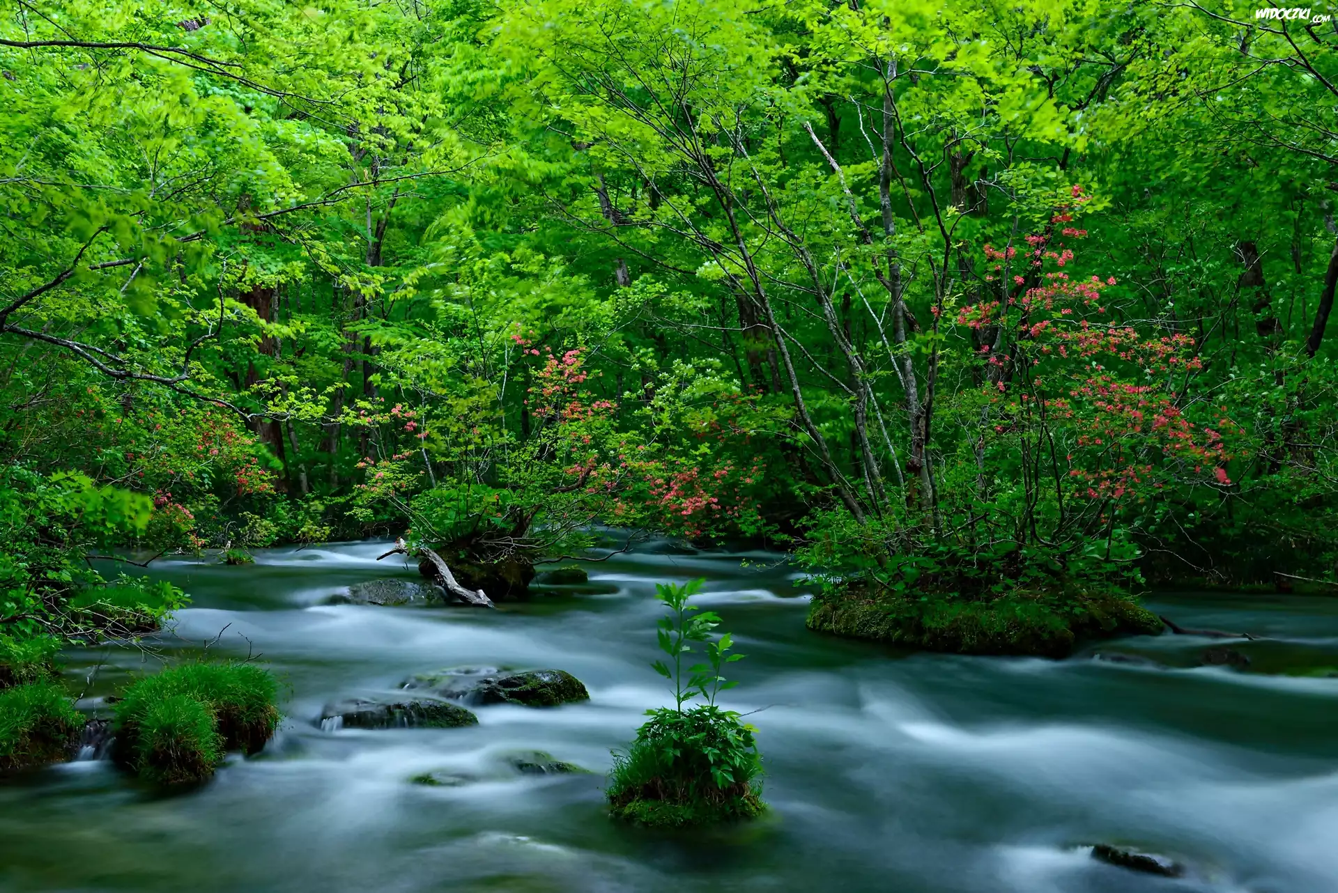Las, Rzeka, Lato, Roślinność, Zieleń