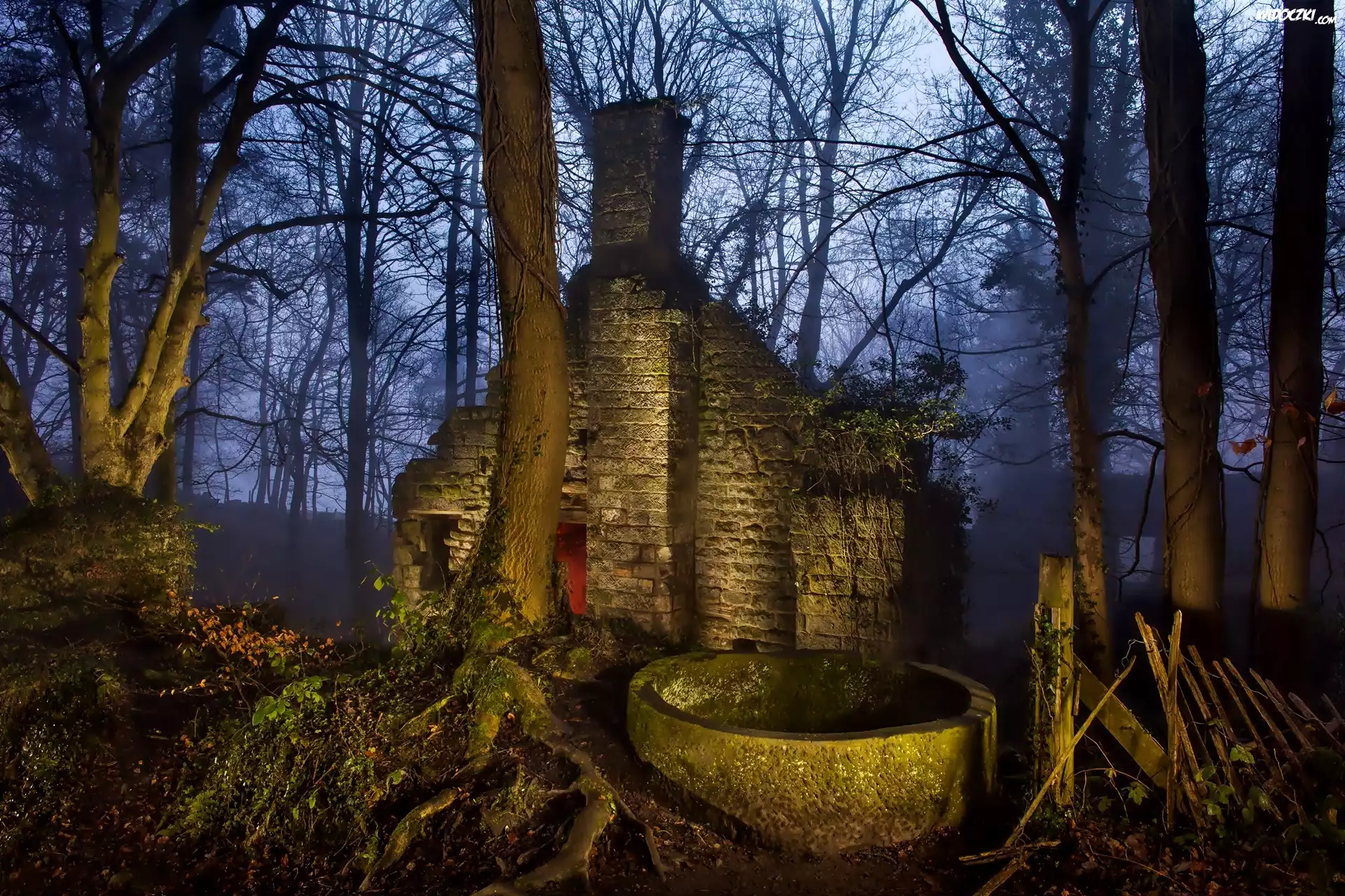 Zdjęcia, Las, Noc, Mgła, Ruina, Budynku