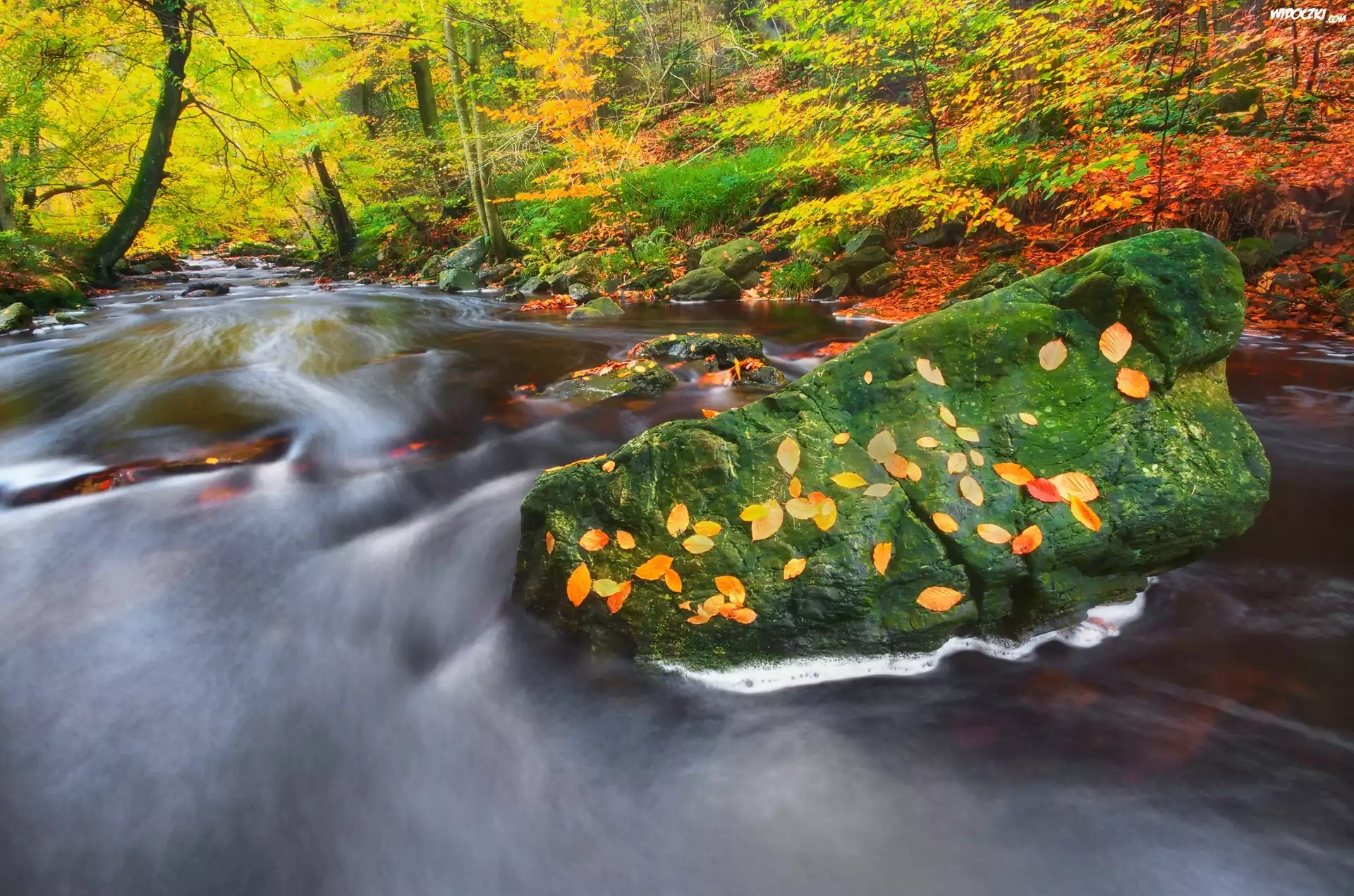 Zdjęcia, Las, Liście, Drzewa, Rzeka, Kamienie