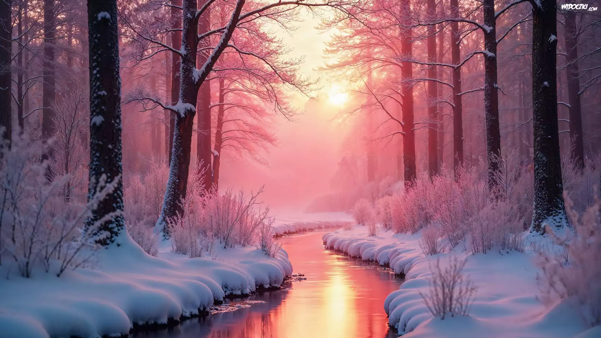Zdjęcia, Zima, Las, Rzeka, Poranek, Drzewa