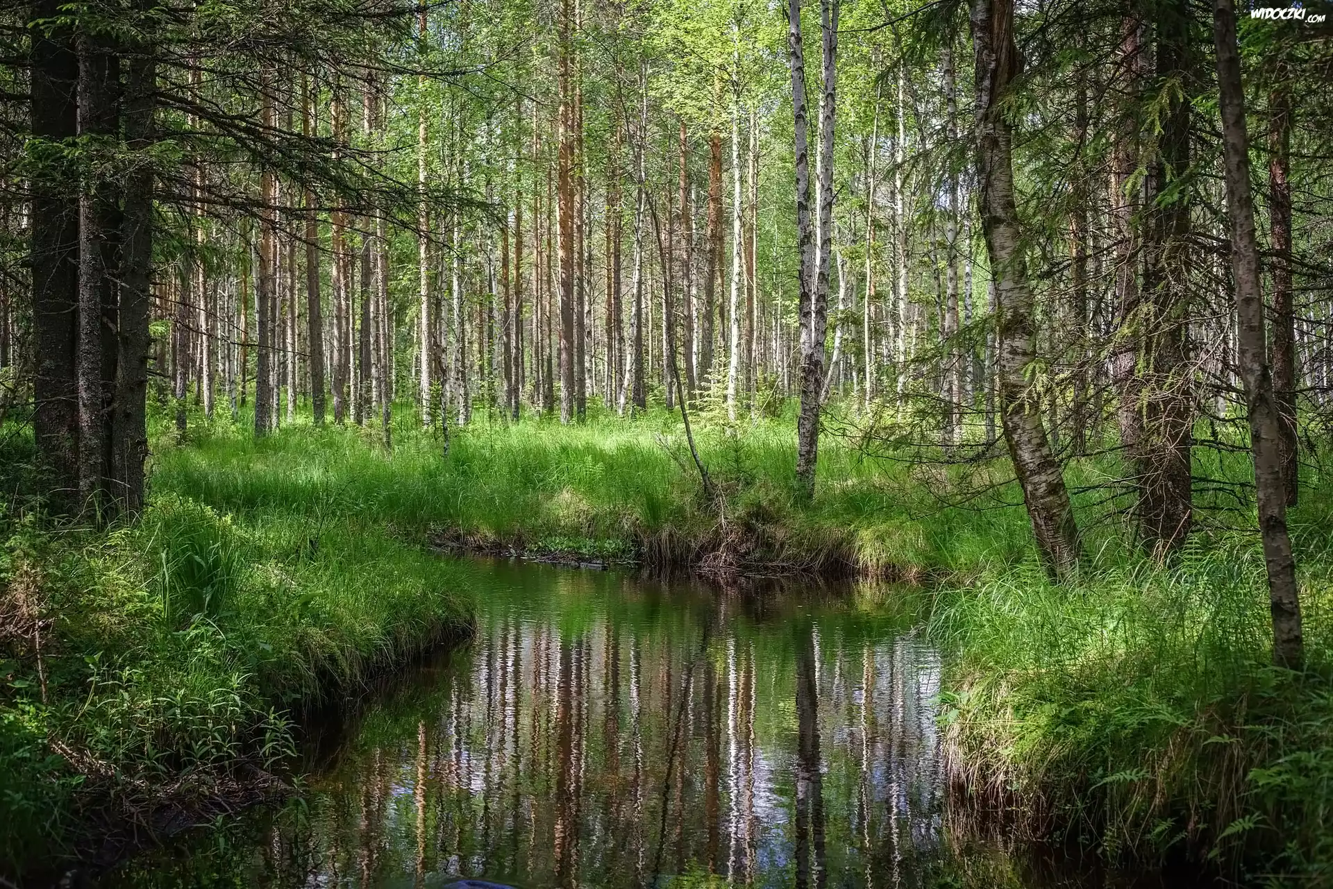 Zdjęcia, Las, Drzewa, Rzeka, Trawa