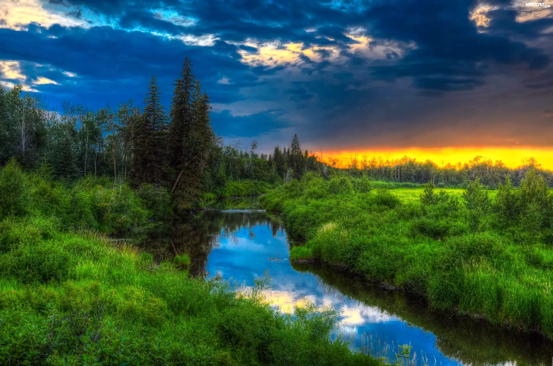Rzeka, Las, Krzewy, Zachód Słońca, Alberta, Kanada