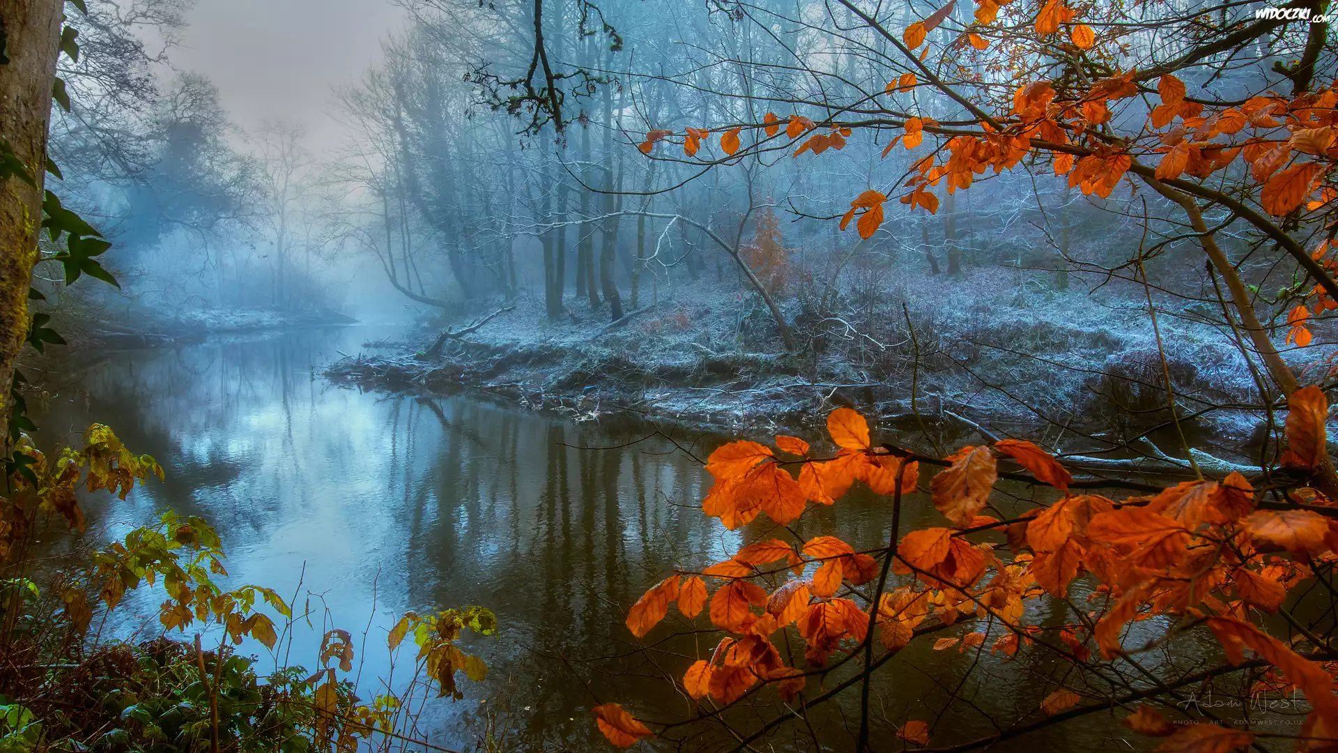 Zdjęcia, Rzeka, Las, Drzewa, Gałąź, Czerwone, Liście, Mgła