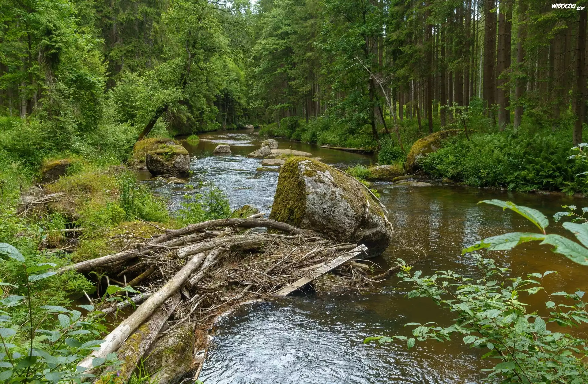 Zdjęcia, Rzeka, Las, Kamienie, Drzewa, Konary, Gałęzie, Rośliny