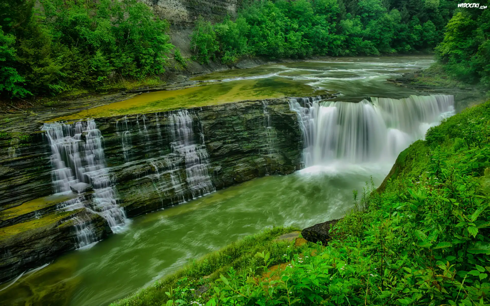 Las, Drzewa, Skały, Wodospad, Rzeka, Rośliny
