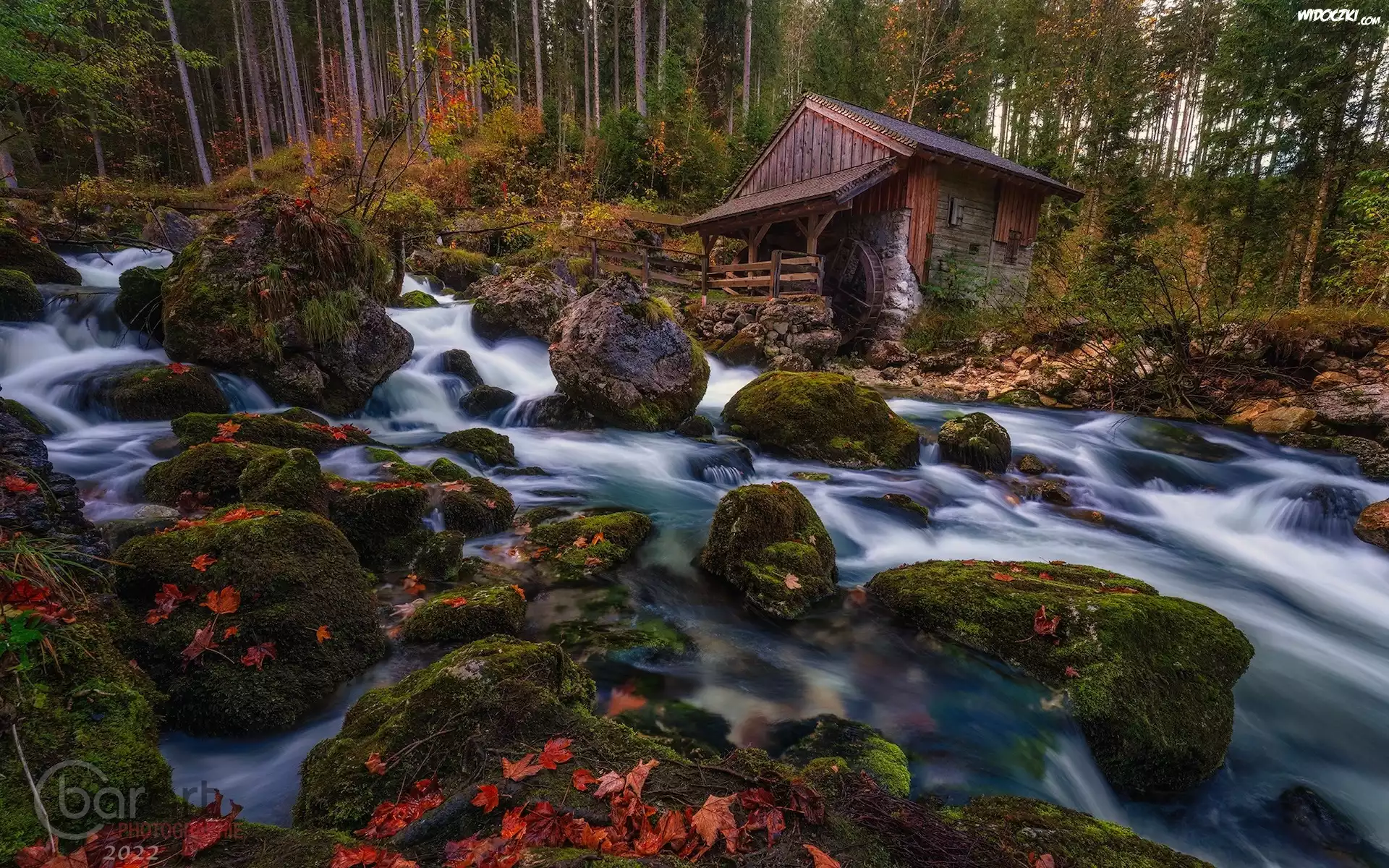 Zdjęcia, Młyn wodny, Rzeka, Las, Kamienie, Omszałe, Liście