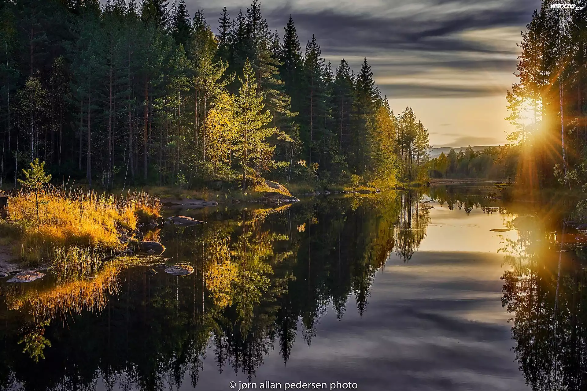 Zdjęcia, Las, Jesień, Wschód słońca, Rzeka, Odbicie
