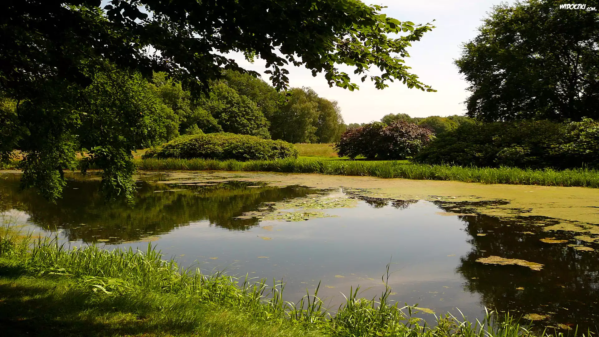 Jezioro, Las, Drzewa, Krzewy, Trawa, Rośliny, Wodne, Rzęsa