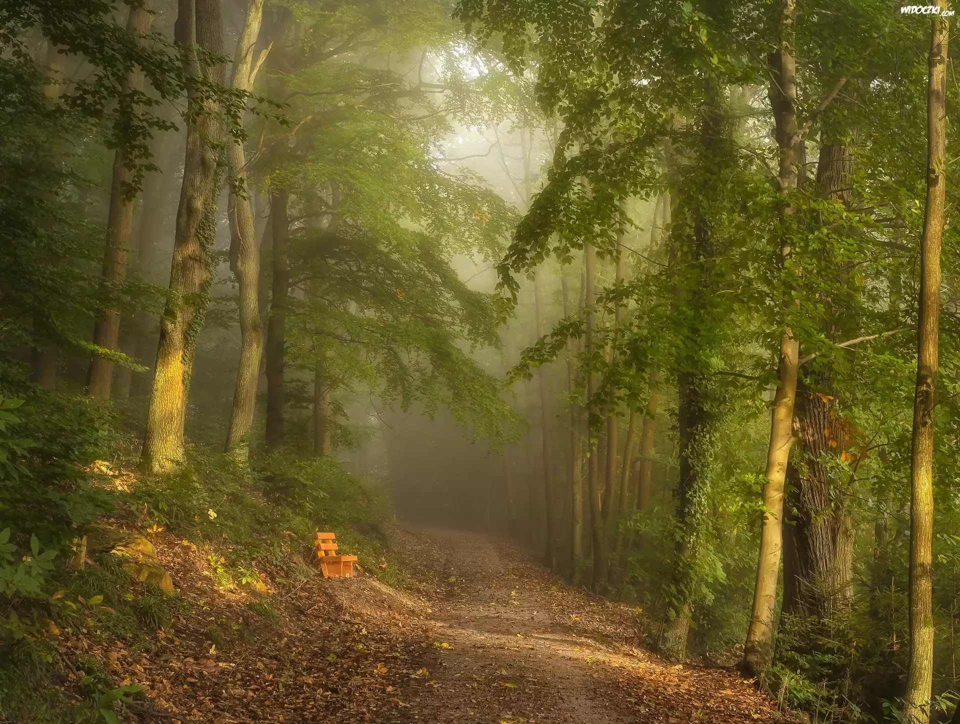 Las, Drzewa, Mgła, ścieżka, Ławka