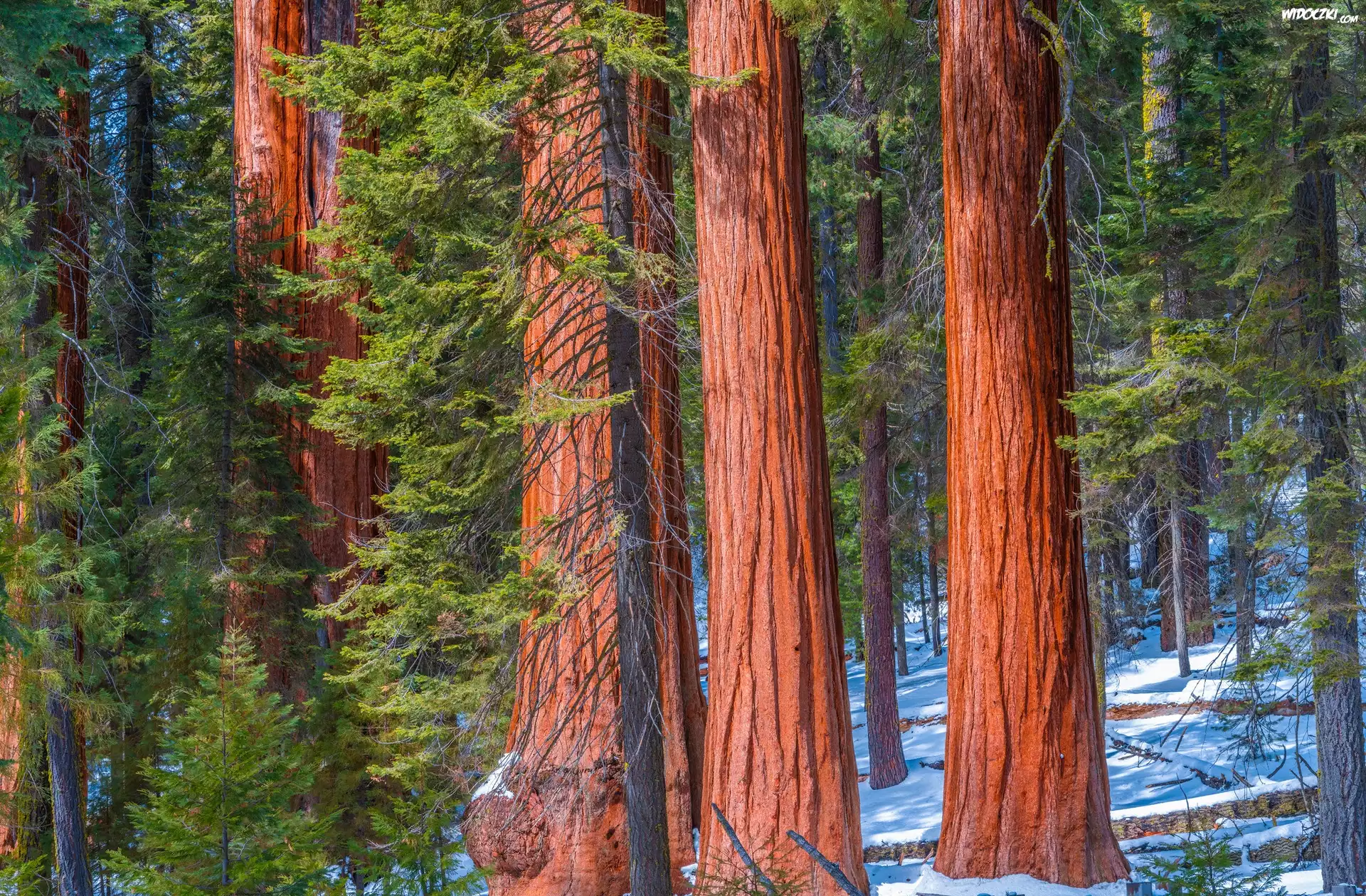 Zdjęcia, Las, Śnieg, Drzewa, Sekwoje, Pnie