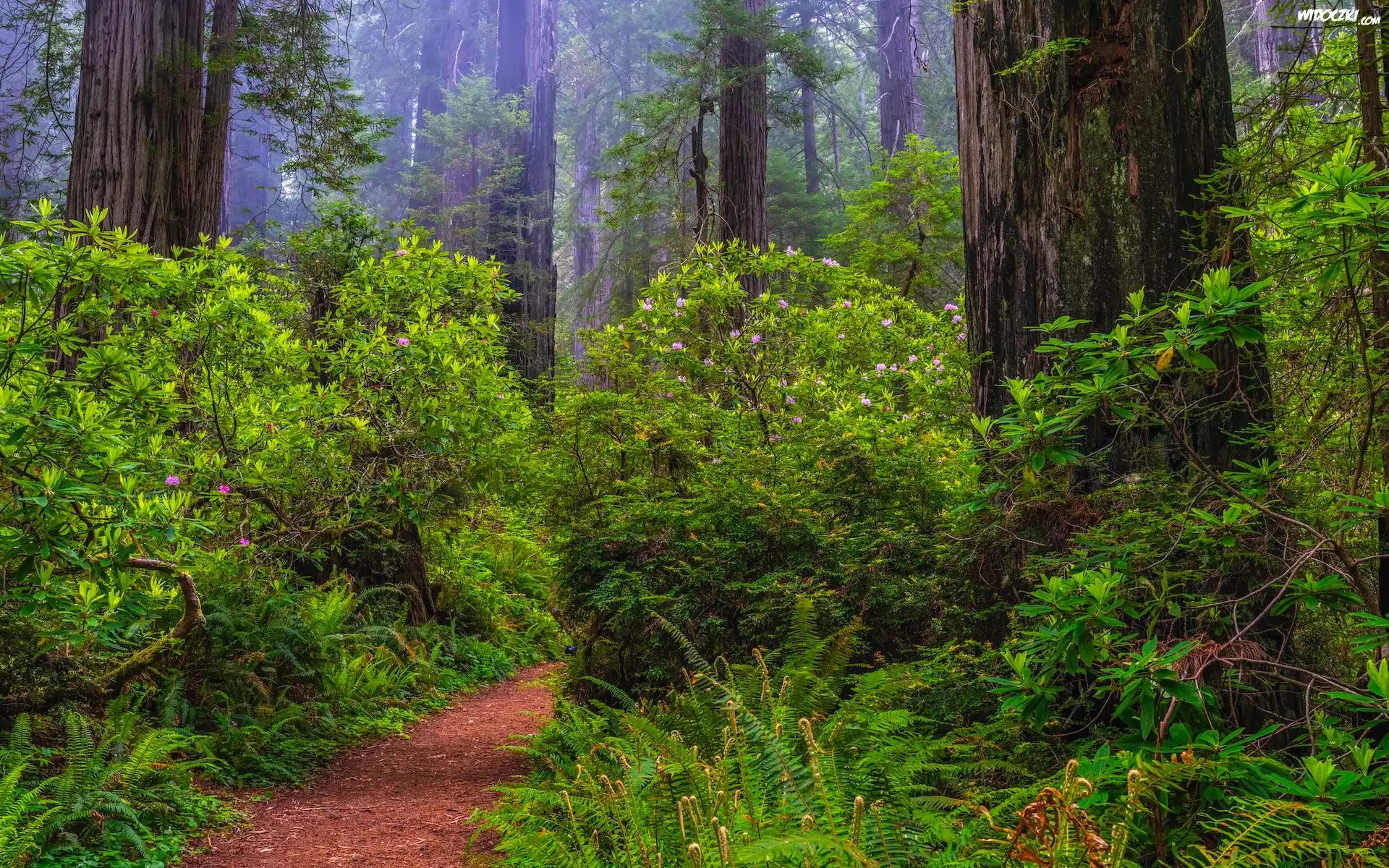 Zdjęcia, Stany Zjednoczone, Kalifornia, Park Narodowy Redwood, Las, Sekwoje, Różaneczniki, Paprocie, Ścieżka