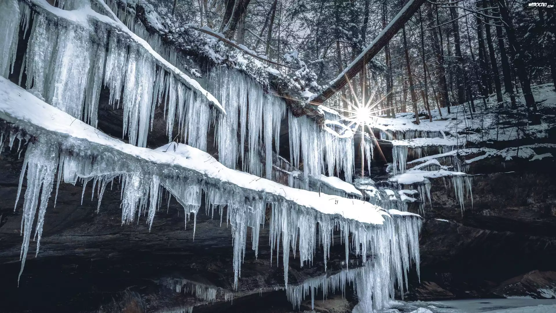 Zdjęcia, Sople, Lód, Skała, Zima, Promienie słońca, Drzewa, Las